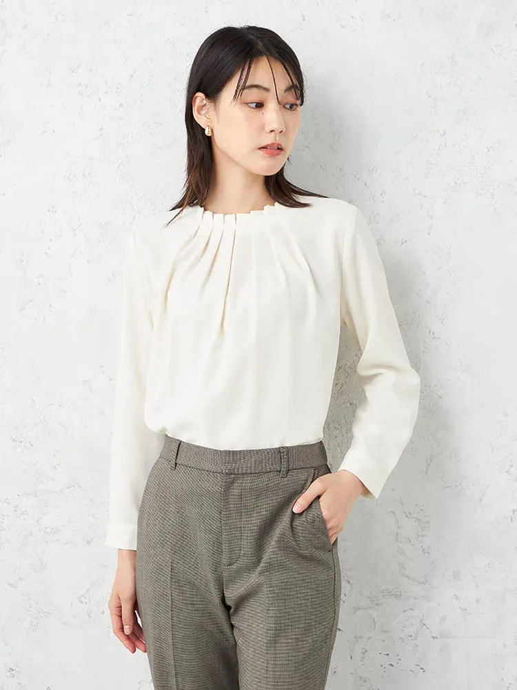フロントのタックディテールで美しいドレープを演出した2枚仕立ての8分袖ブラウス。