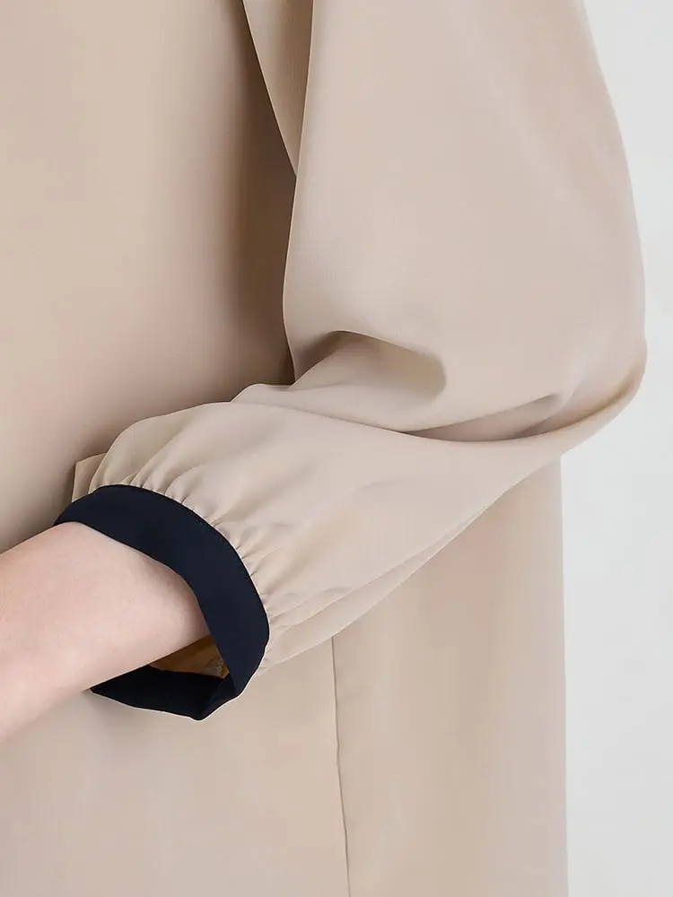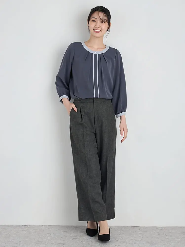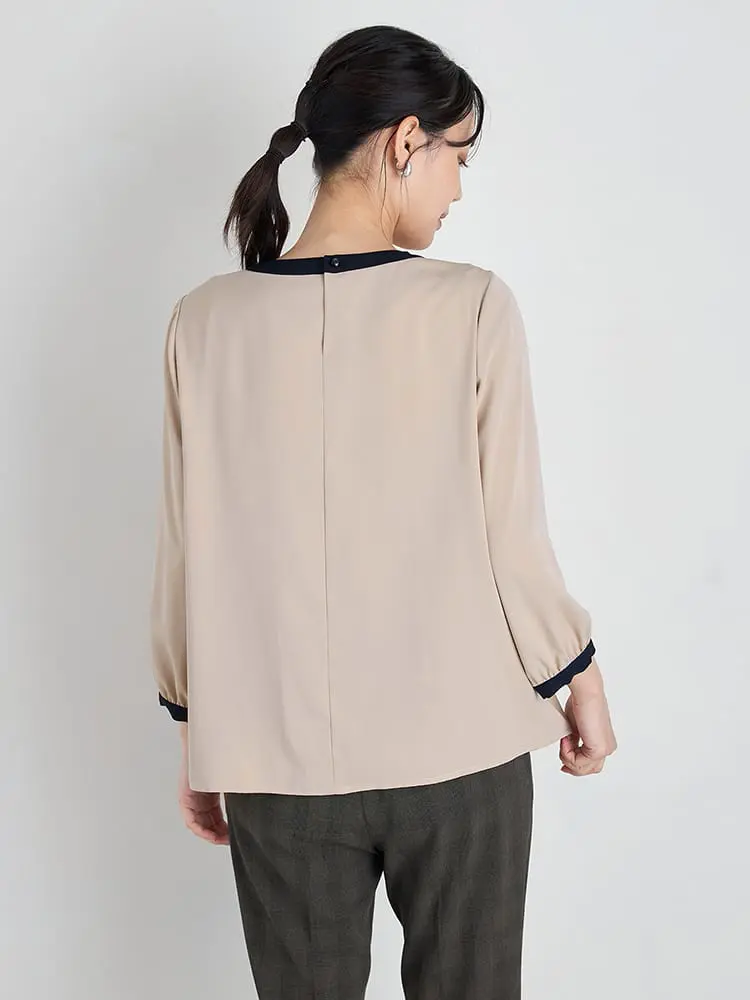 ネックラインや袖口を配色で切り替えた、エレガントな仕立てです。