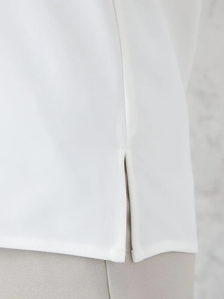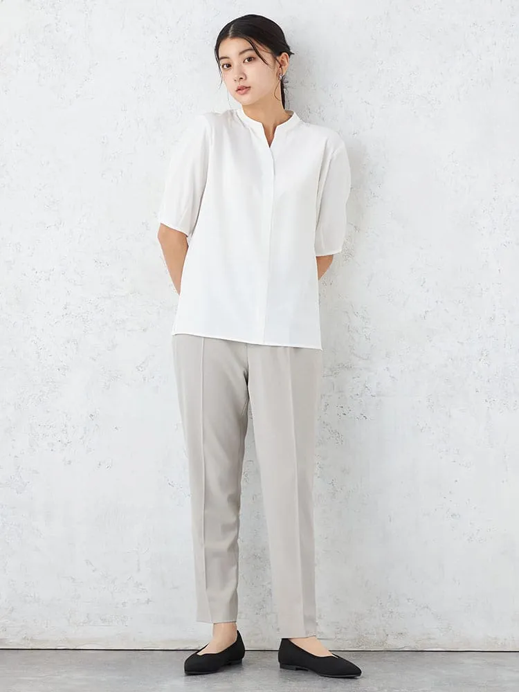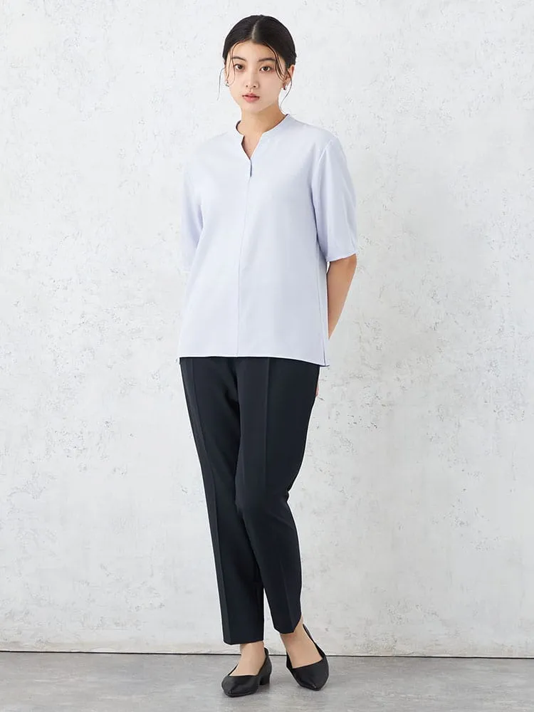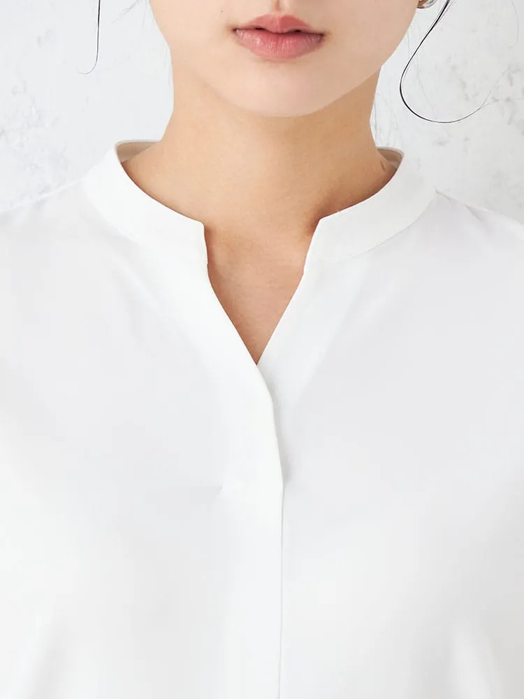 スラッシュ開きのスタンドカラーブラウスです。