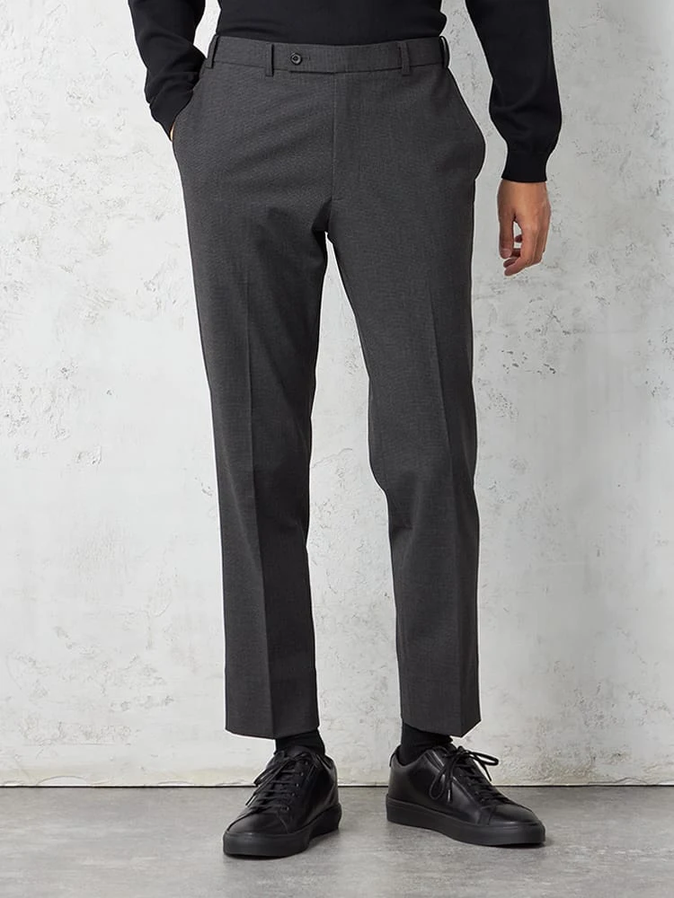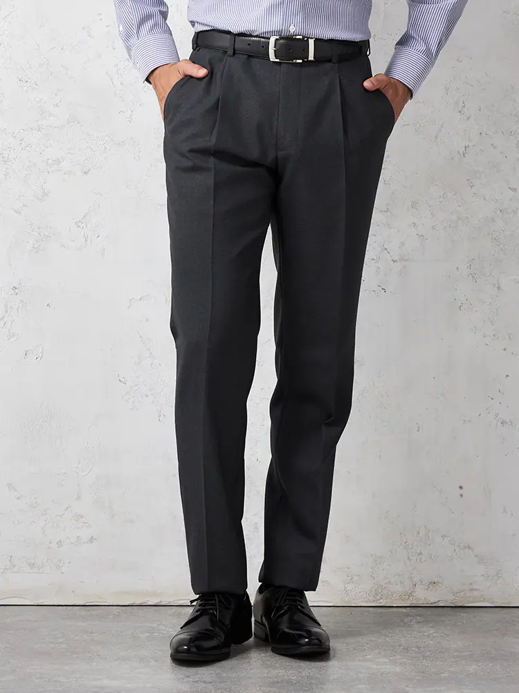 あわせるアイテムを選ばない落ち着いたグレーカラーが魅力、シルエットに立体感を作るワンタックとセンタープレス加工で脚のラインをきれいに見せてくれます。