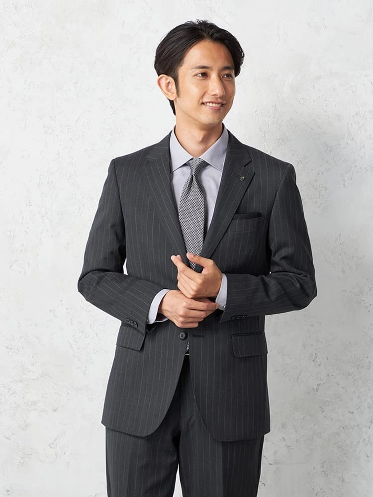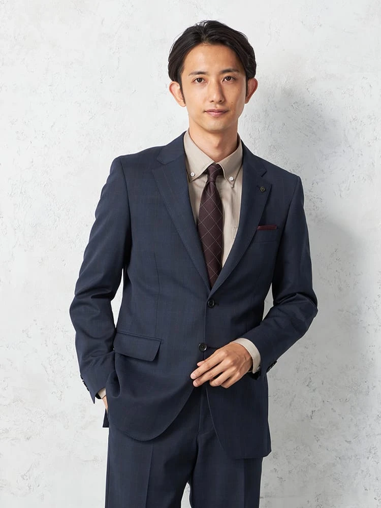 スマートな細身シルエットで、モダンなビジネスルックを叶えた1着です。