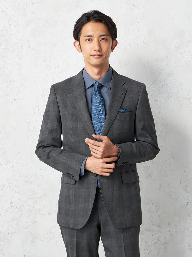 サスティナブルウール素材を使用し、環境にも配慮したツーピーススーツ。