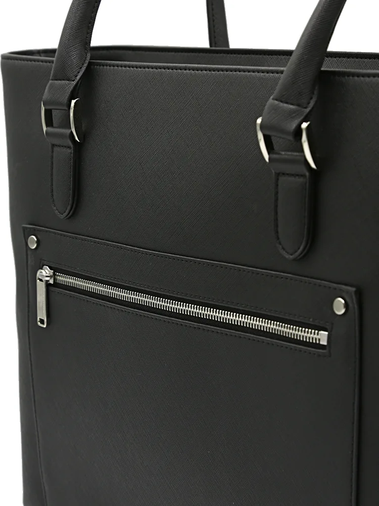 サフィアーノ調の型押し合成皮革に、前面のメタルファスナーポケットがアクセントになり、シャープでスマートな印象です。