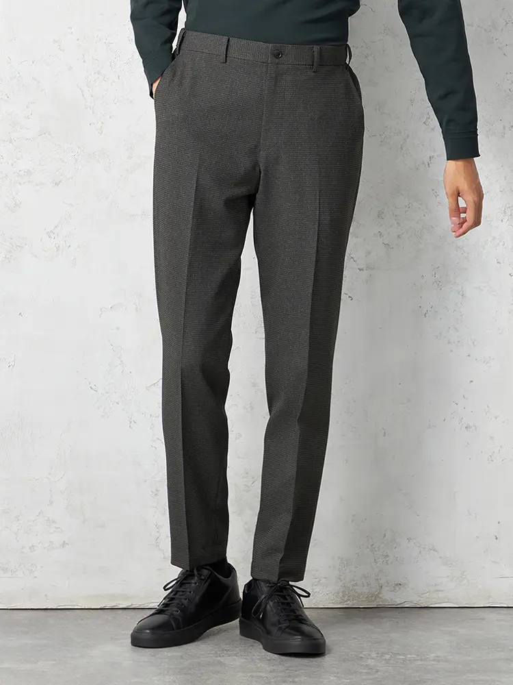 シャープなシルエットが魅力のスリムタイプながら、ストレッチ性のあるニット素材を使用しているため窮屈感なく着用いただけます。