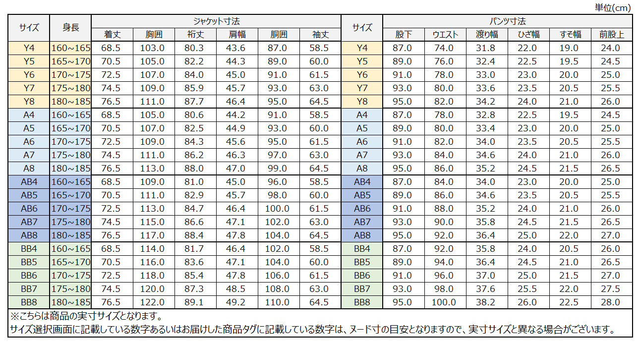 スリム(Y体) 標準(A体) がっちり(AB体) ゆったり(BB体) 165cm(4号) ☓ 170cm(5号) 175cm(6号) 180cm(7号) 185cm(8号) ☓