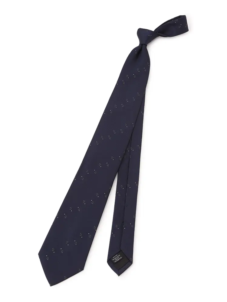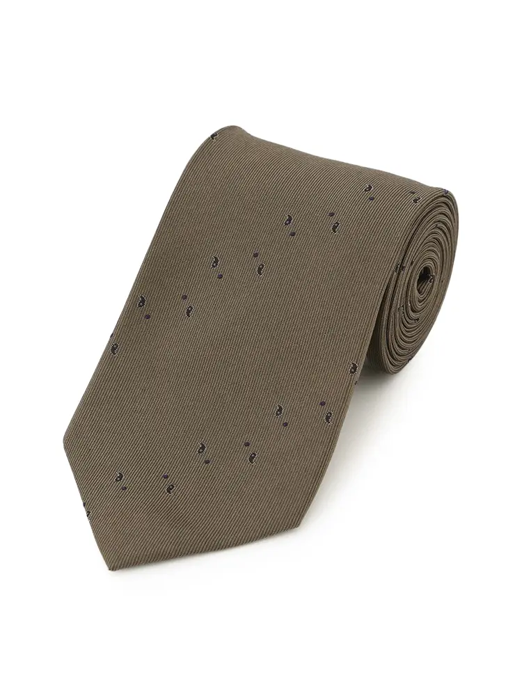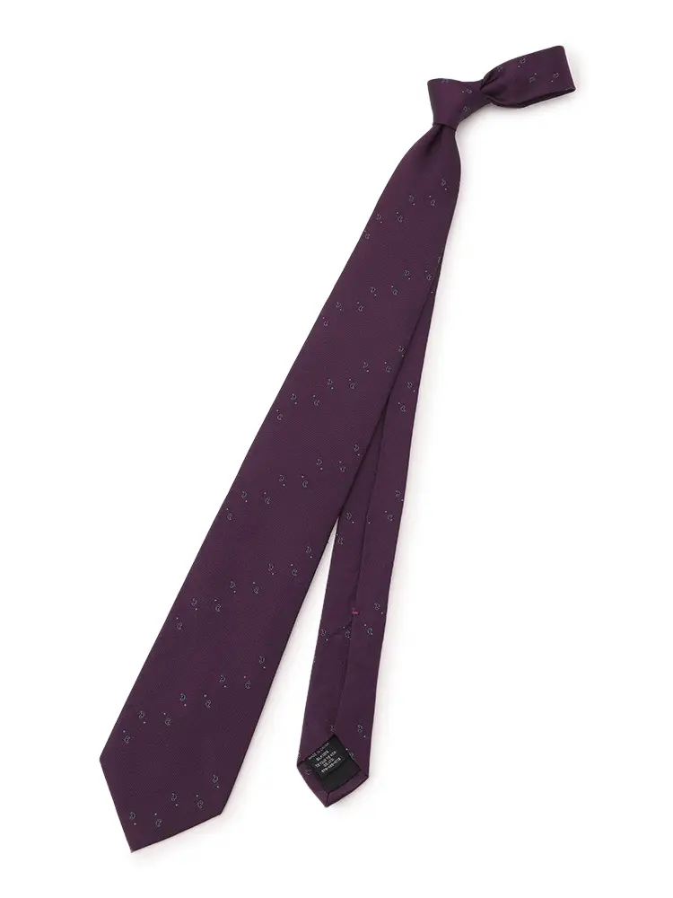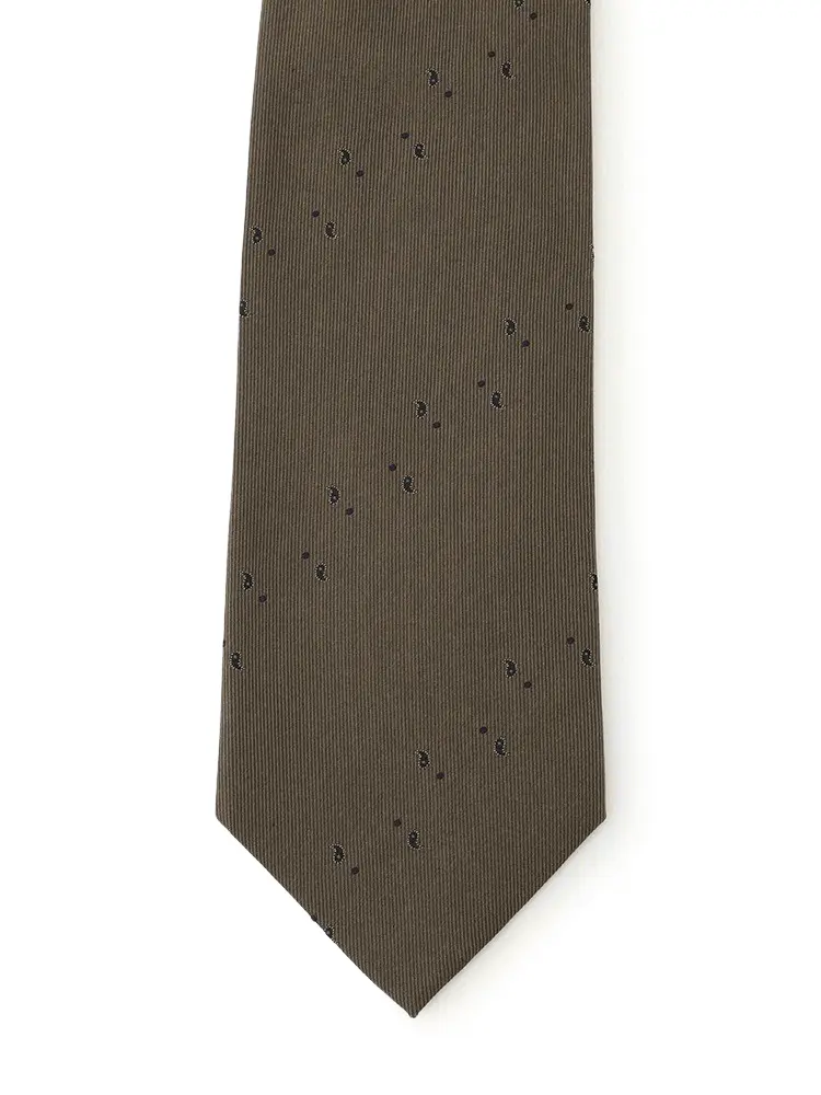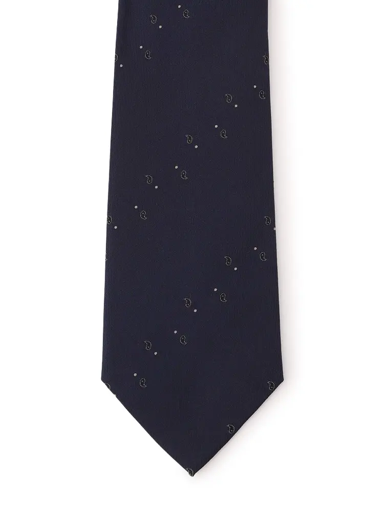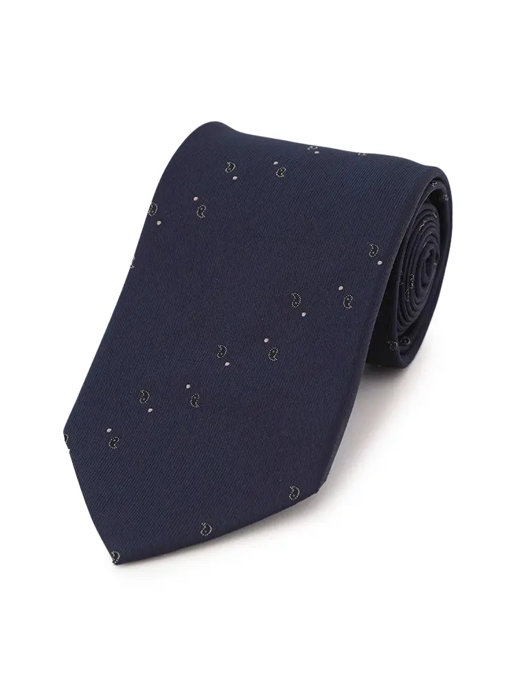小ぶりのペイズリー柄とドットをストライプ状に並べたネクタイ。