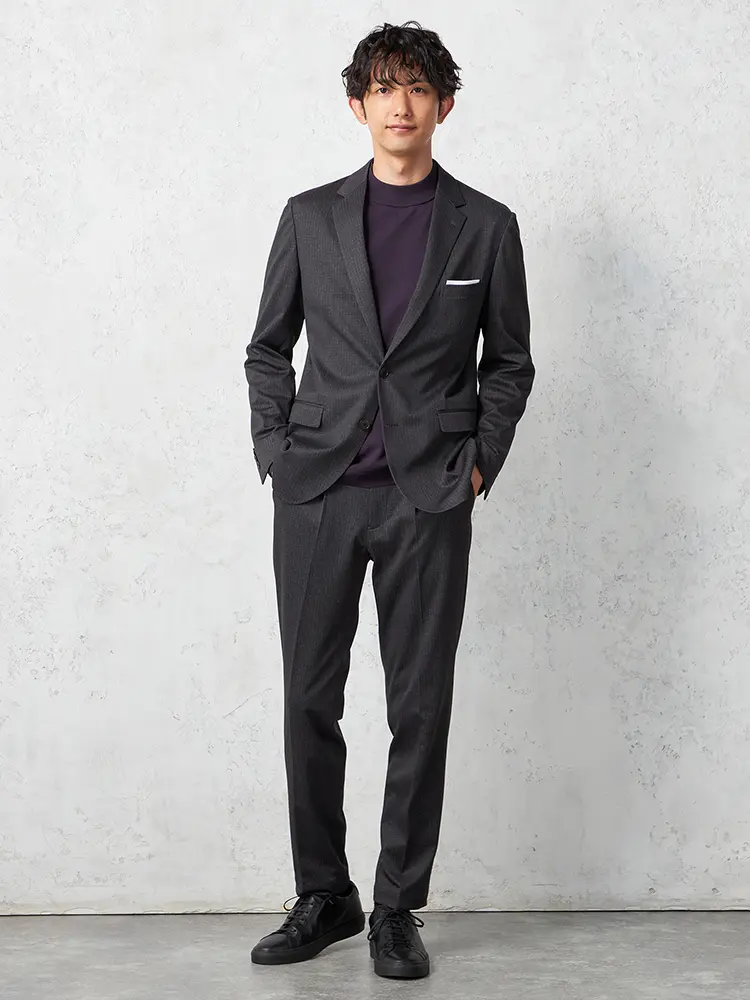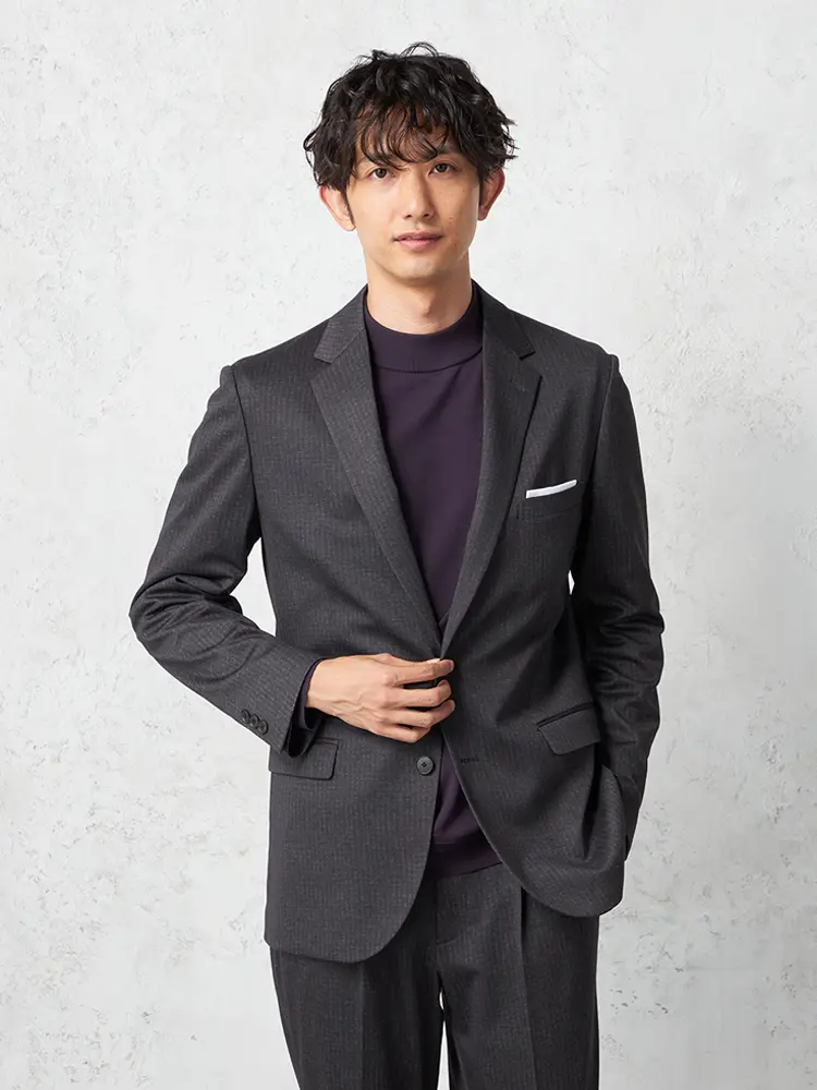 2つボタン×ノッチドラペルのスタンダードなデザインのテーラードジャケット。