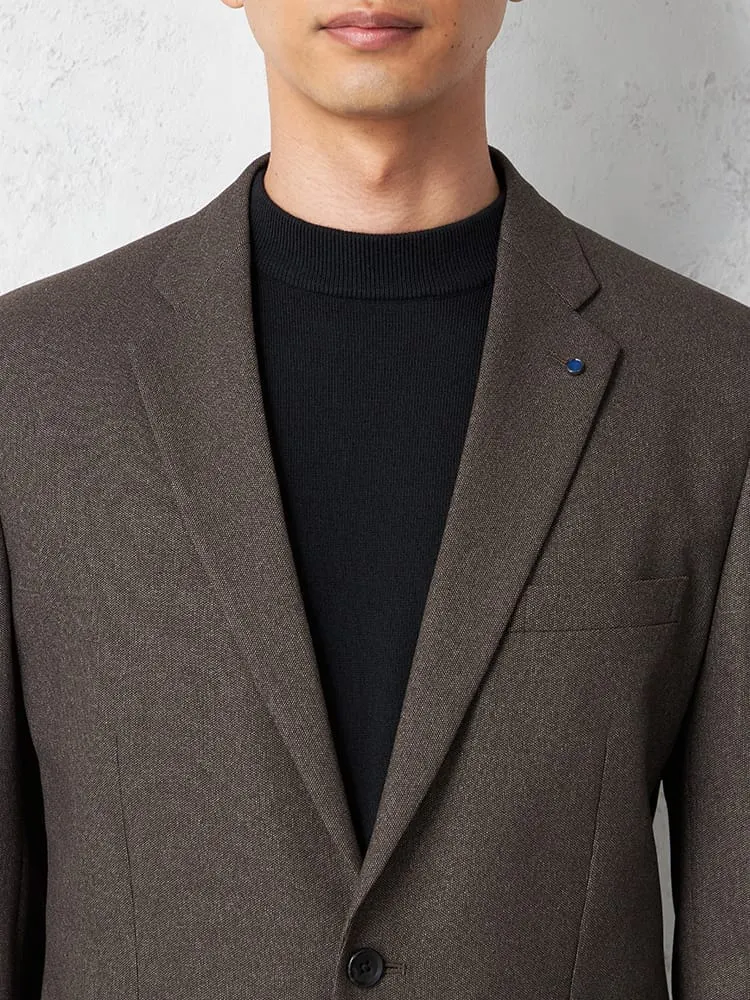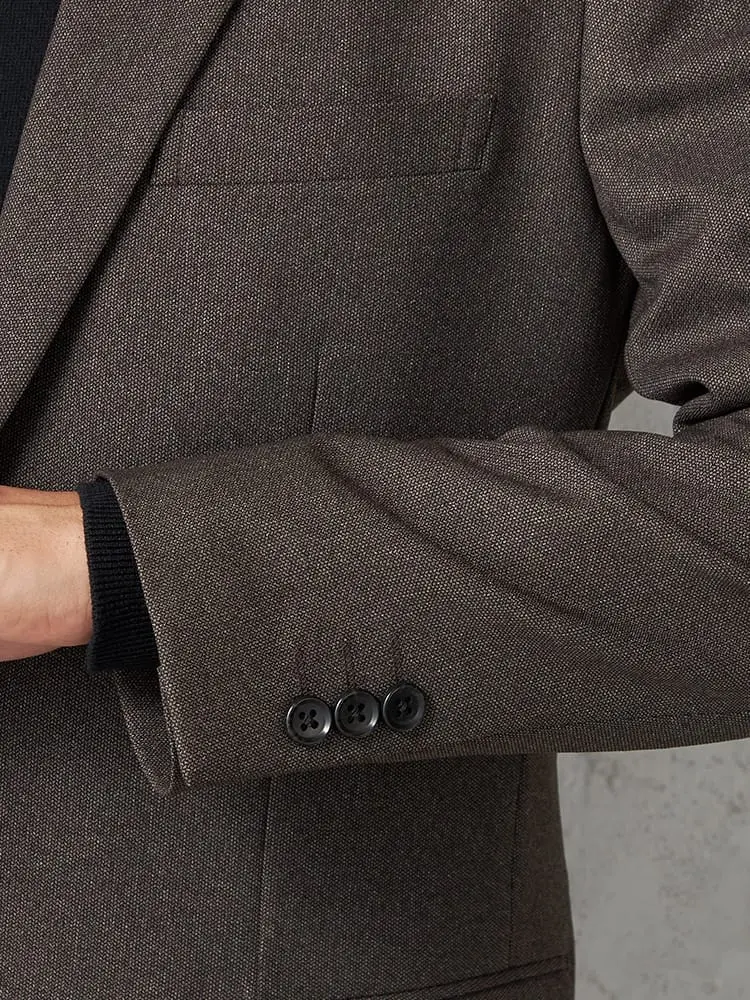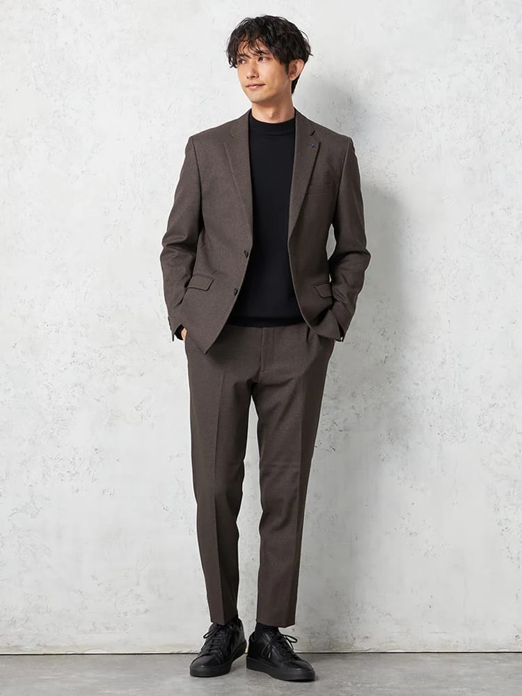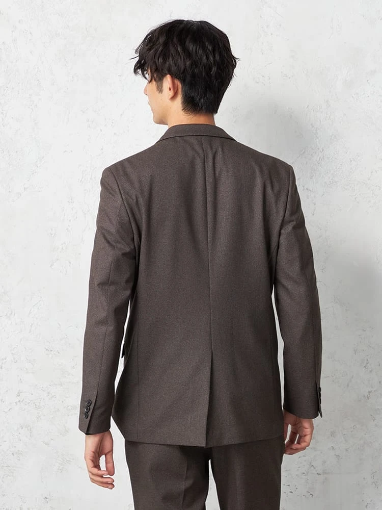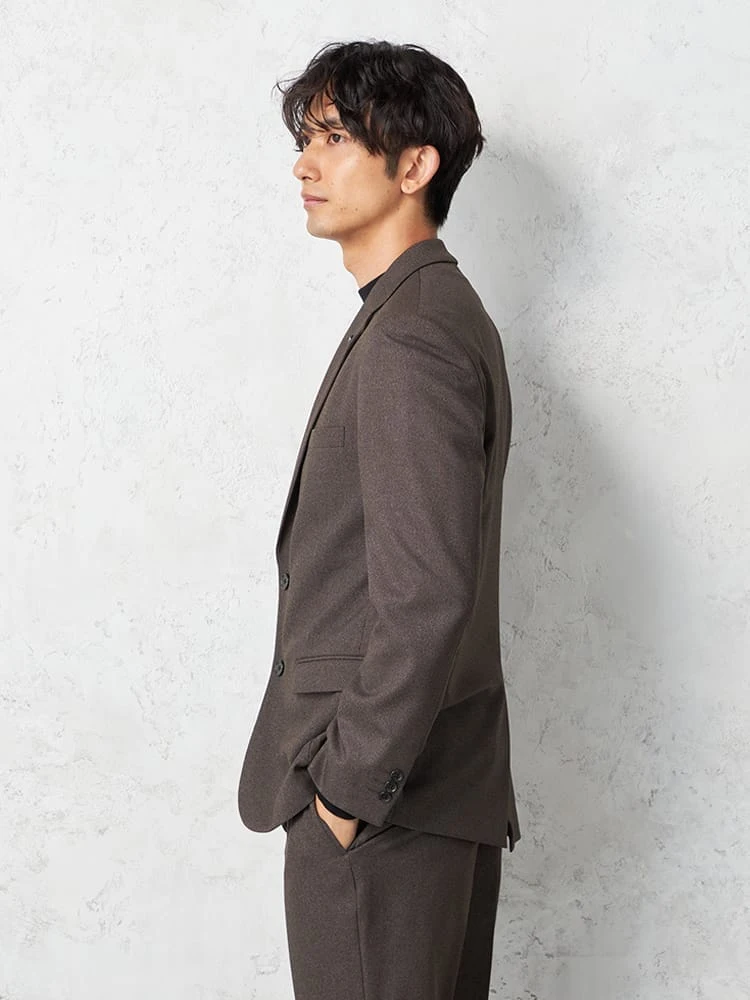 杢柄のブラウンが落ち着いた印象を与える、2つボタンテーラードジャケットです。