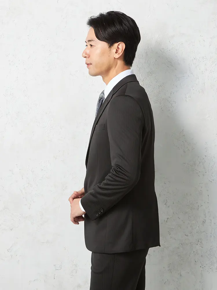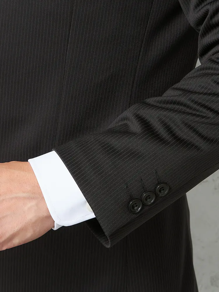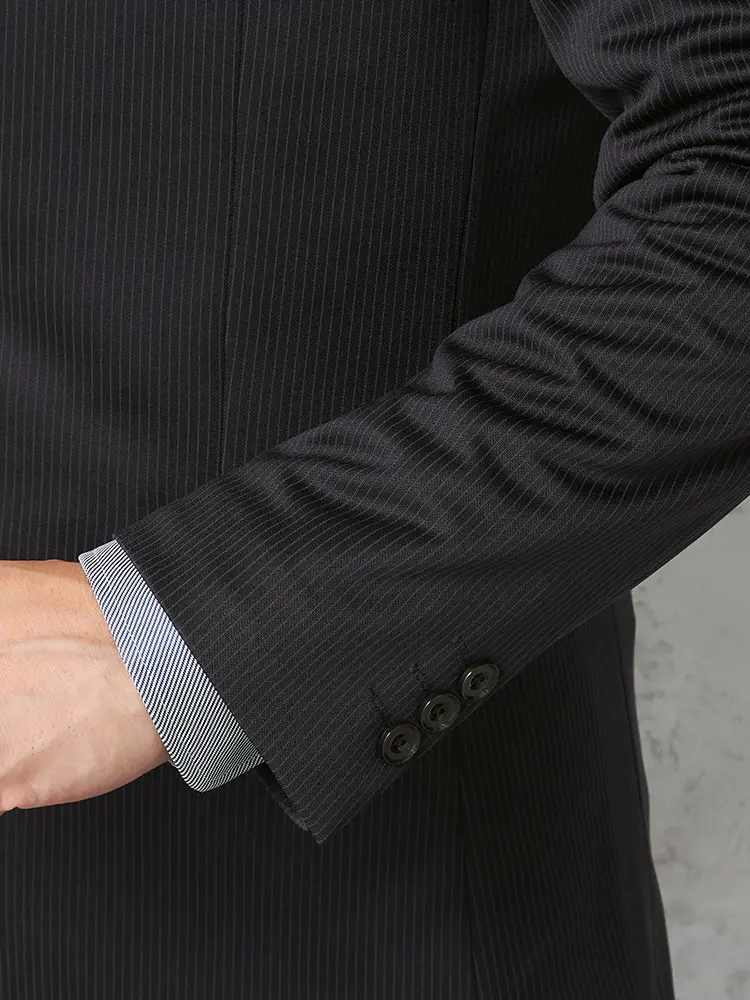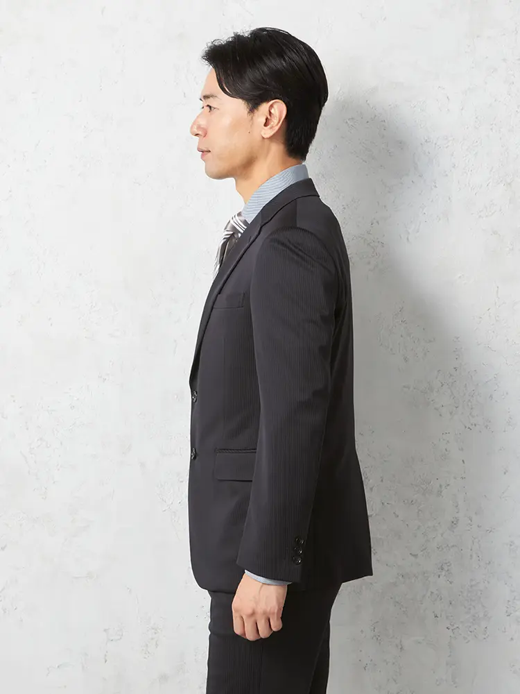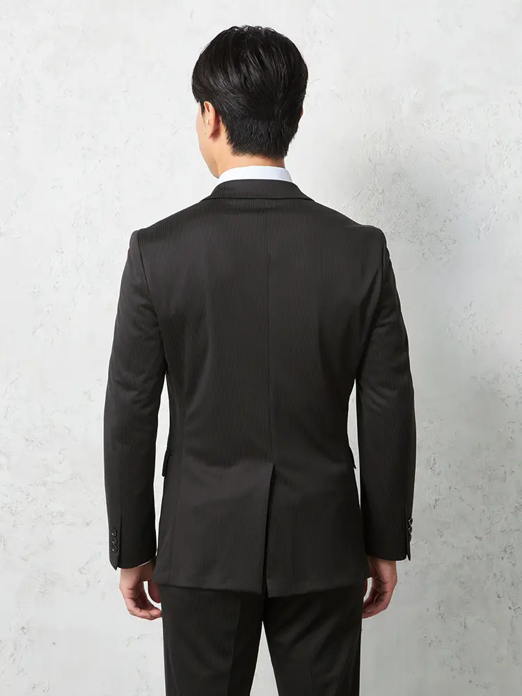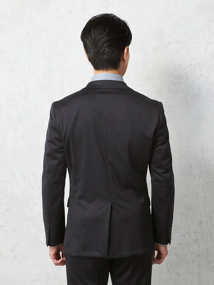 シーンを問わずに活躍する細ストライプ柄のセンターベントのノータックスーツ。