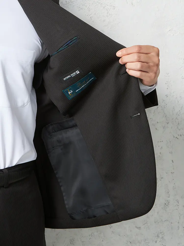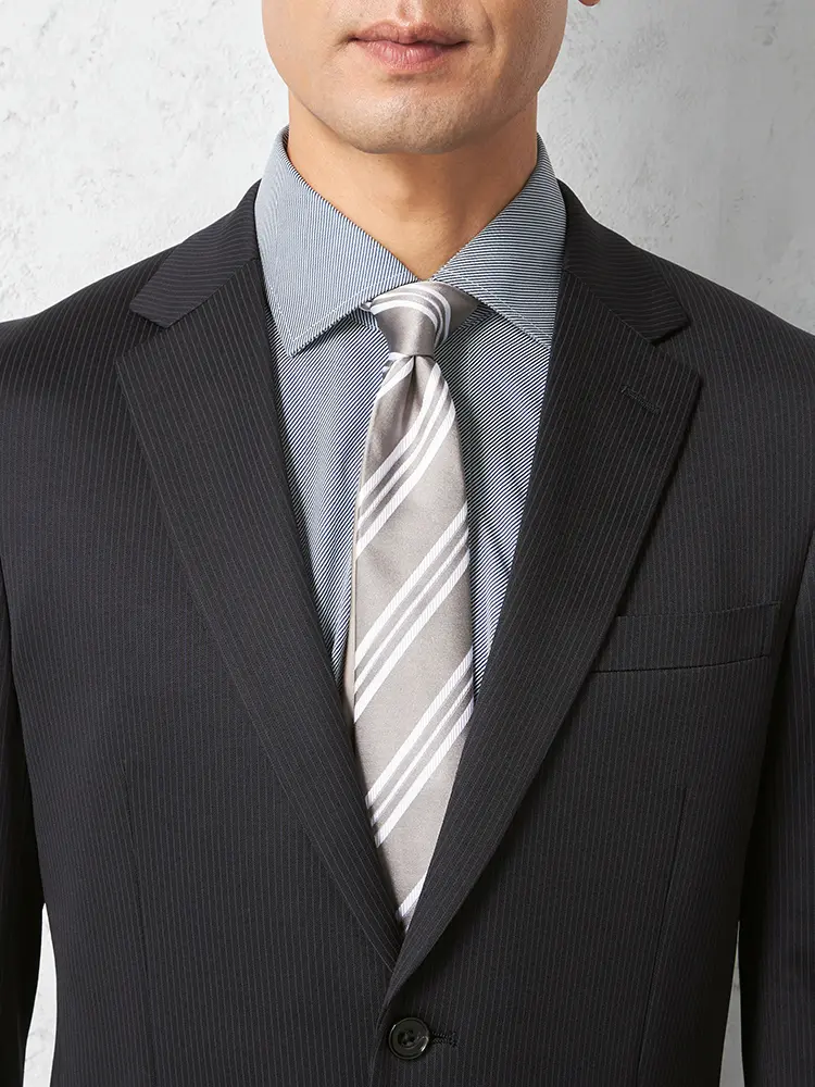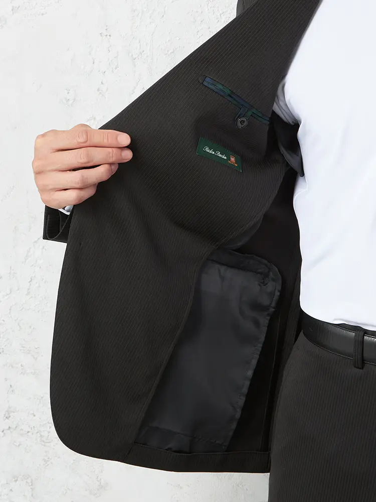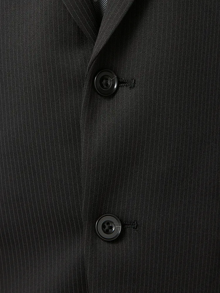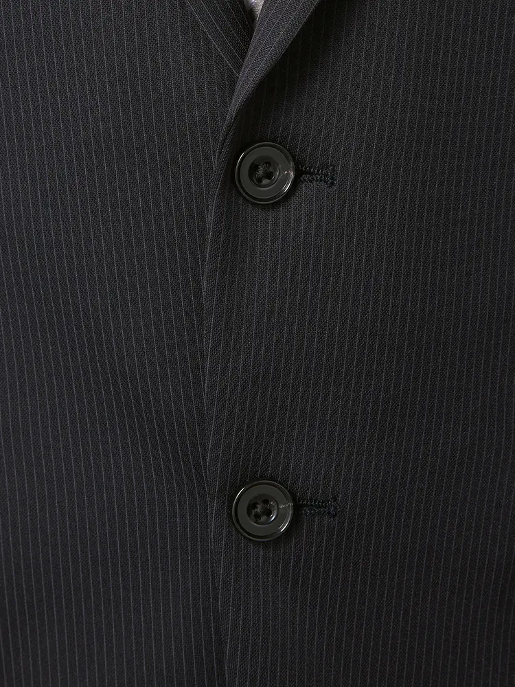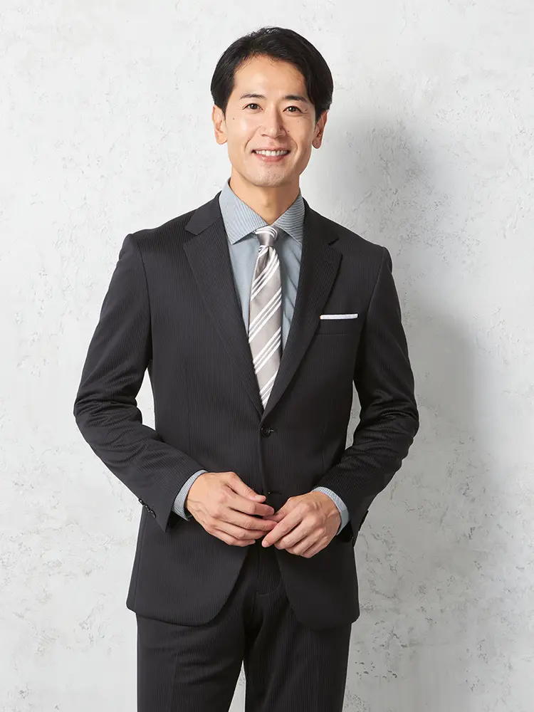 シーンを問わずに活躍する細ストライプ柄のセンターベントのノータックスーツ。