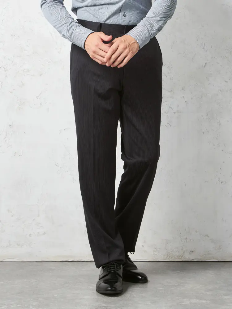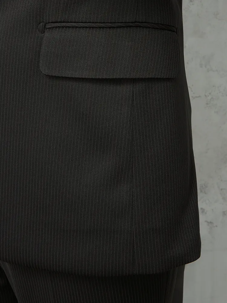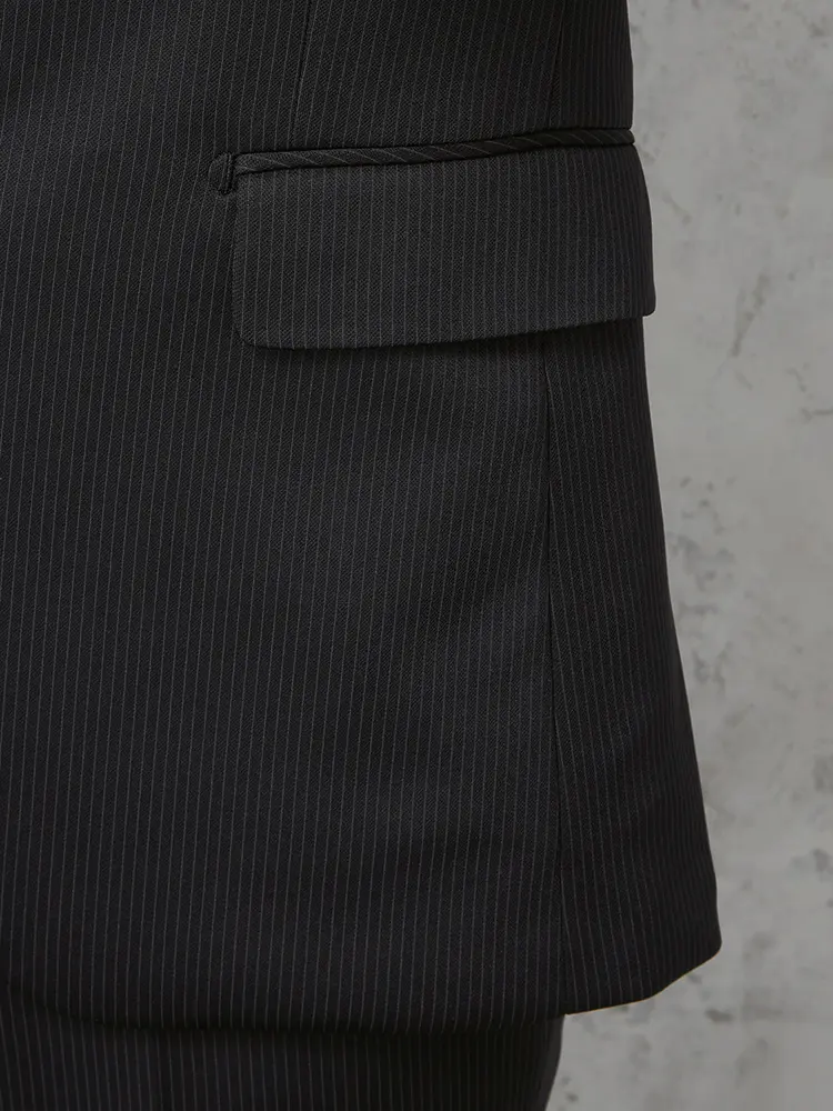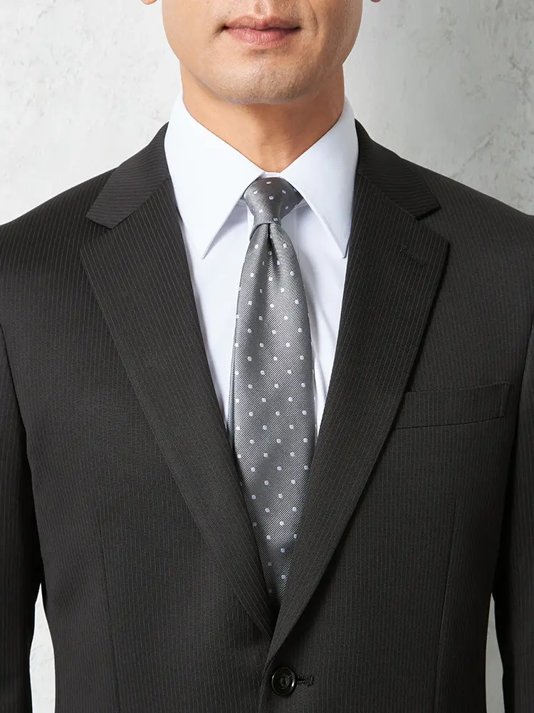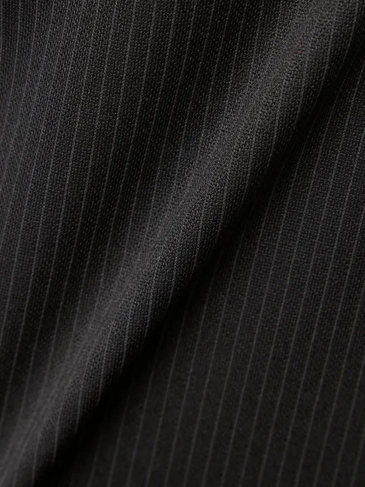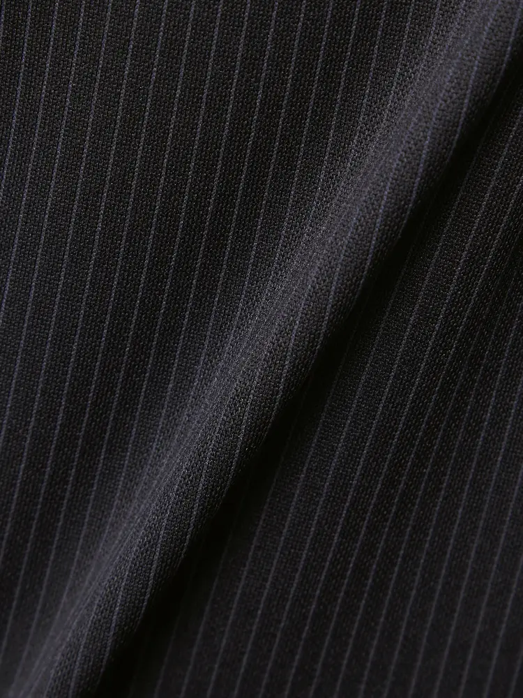 シーンを問わずに活躍する細ストライプ柄のセンターベントのノータックスーツ。