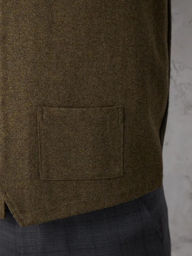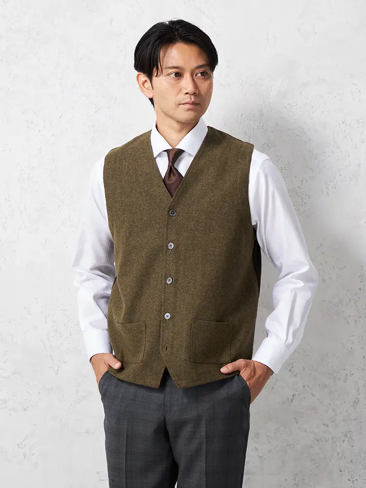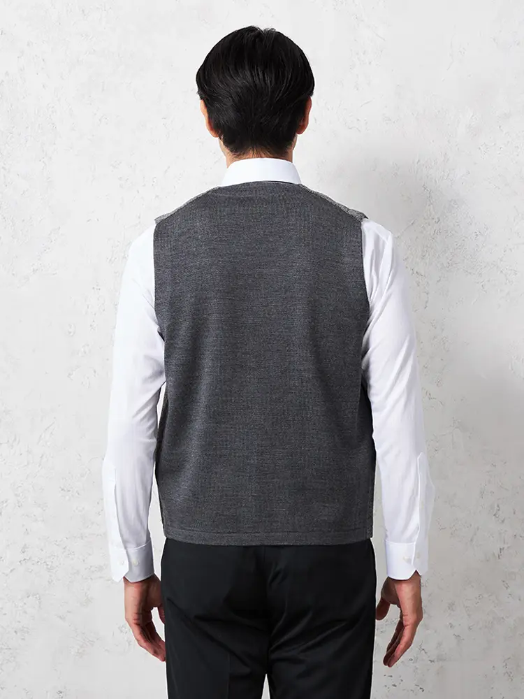 着こなしをエレガントに引き締めるウール混素材のシンプルでクラシカルなベストです。