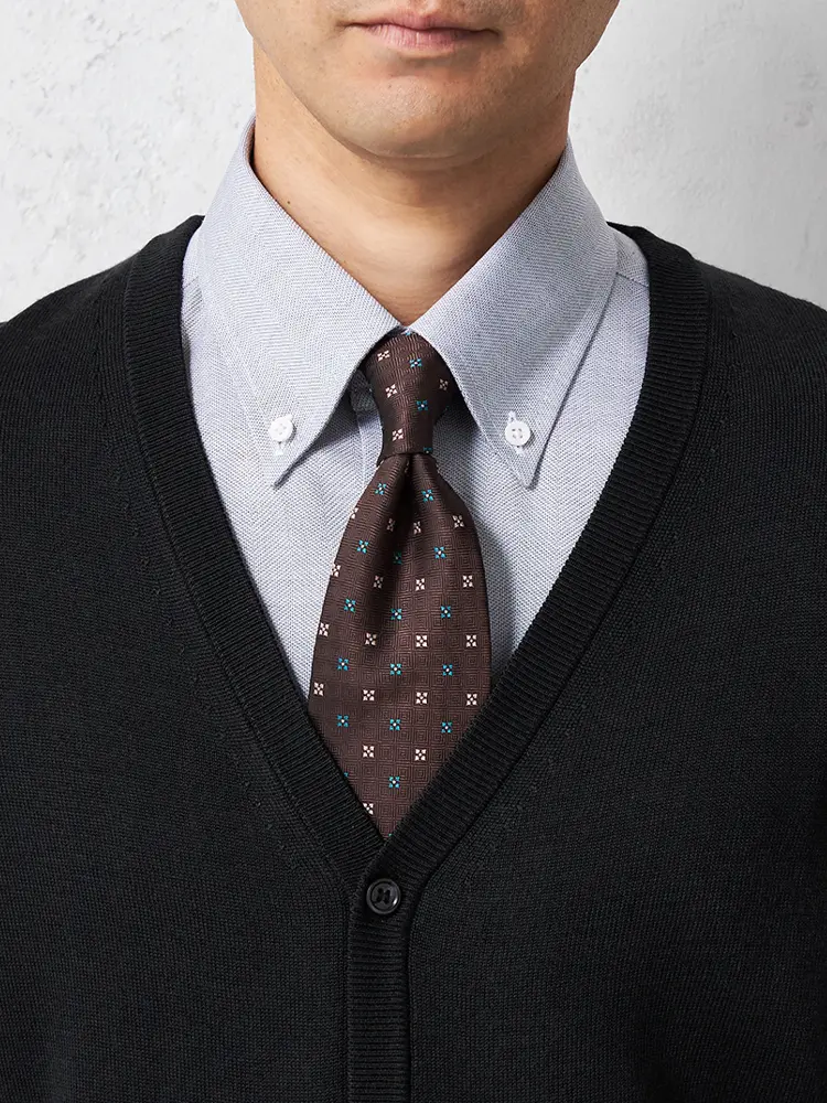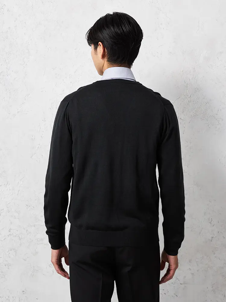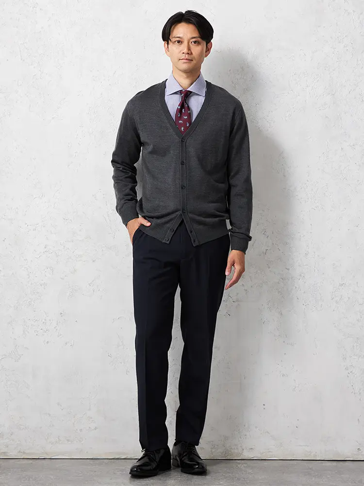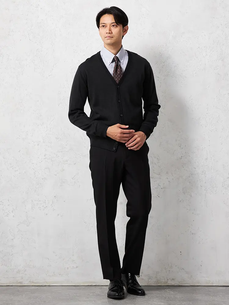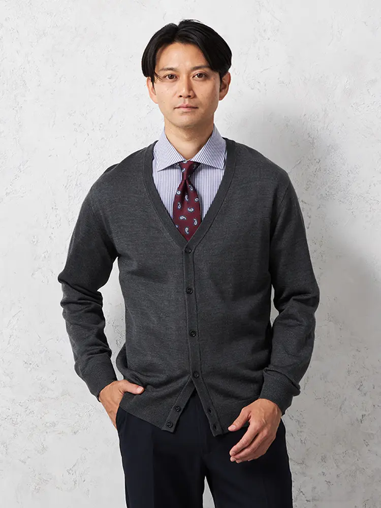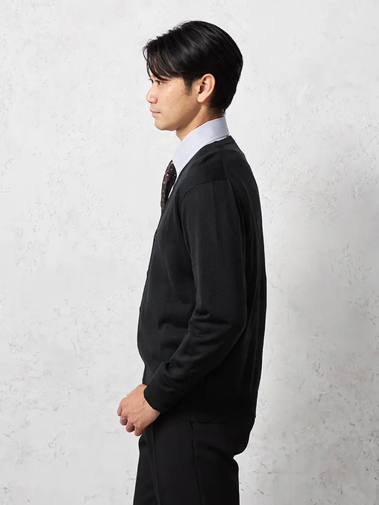 スタイルアレンジ用に一枚持っておきたい、静電気の発生や毛羽立ちを抑えてくれる、アンチピリングと静電気対策を備え保温性もあるVネックのニットカーディガンです。前開きで着脱がしやすいため、室内の暖房が効いていて暑いときに、すぐに脱げるのが最大の魅力。スーツやジャケットの中で、もたつかないサイズ感の定番無地ニットは家庭で洗濯可能(オシャレ着洗い)です。