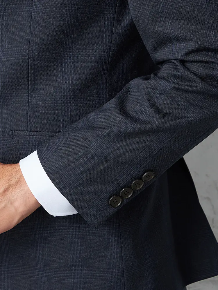 サイドベンツ背抜き仕立て仕様のチェック柄スリーピーススーツ。