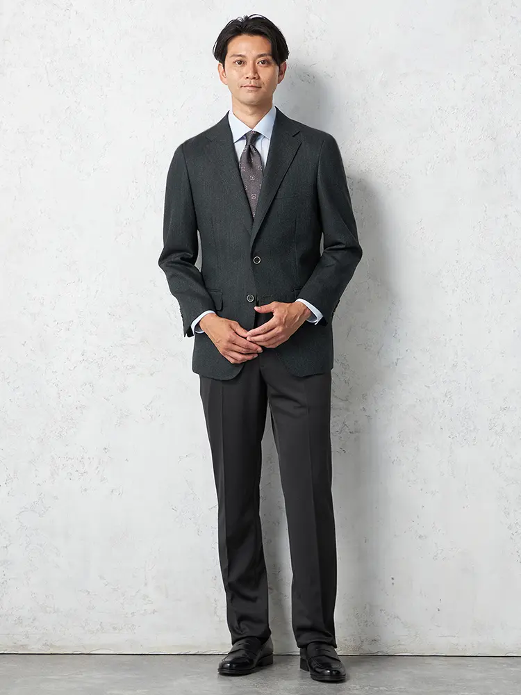 センタープレスや両玉縁のヒップポケットのキレイ目感も特徴。