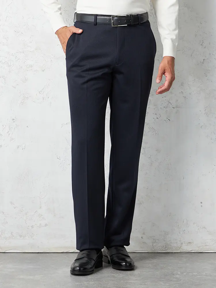 明るすぎず暗すぎず、ほどよいトーンのスマートな印象に穿きこなせるニット素材のウォッシャブル仕様のパンツ。