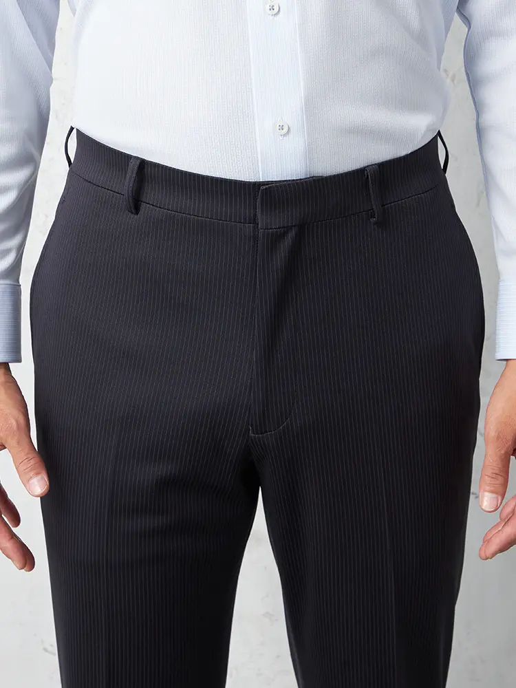 ノータックの腰回りに細ストライプの柄で、スマートな印象に穿きこなせるニット素材のウォッシャブル仕様のパンツ。