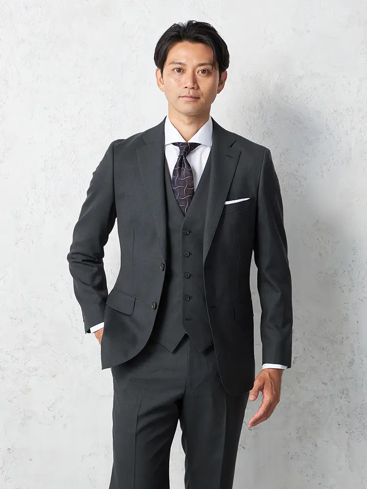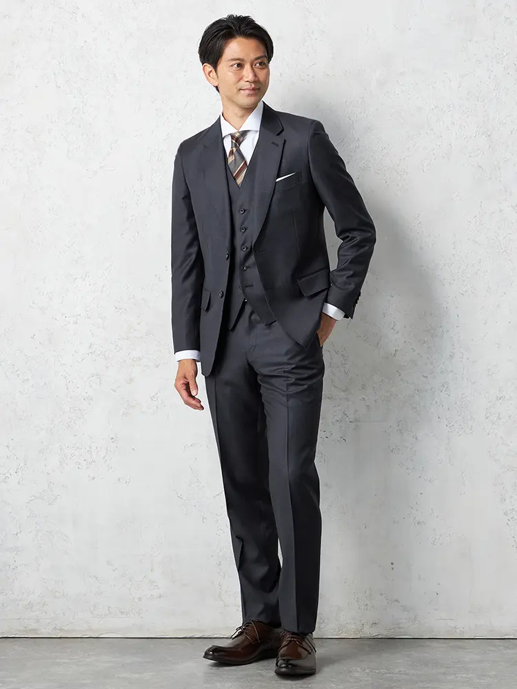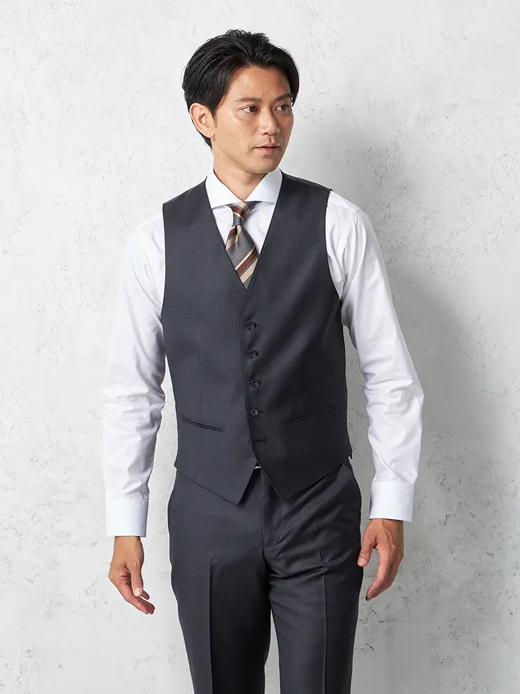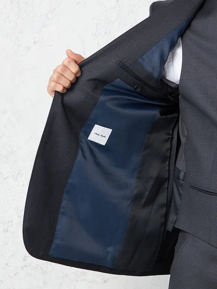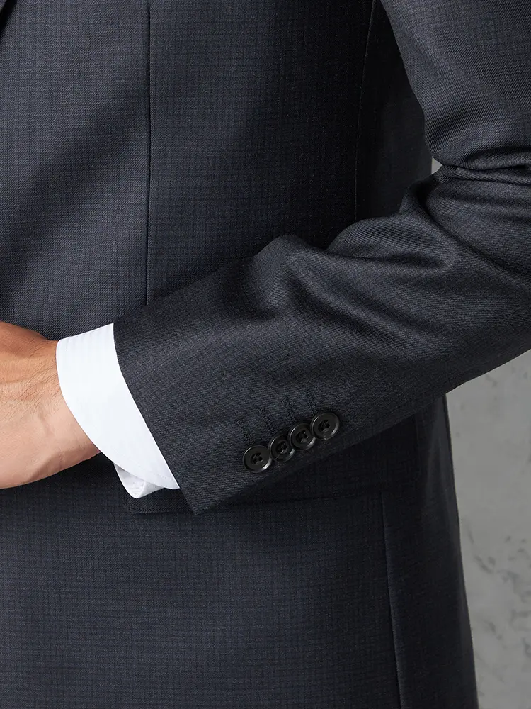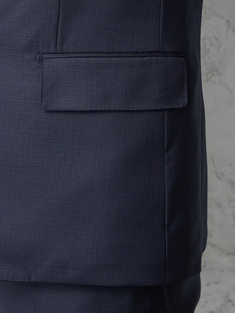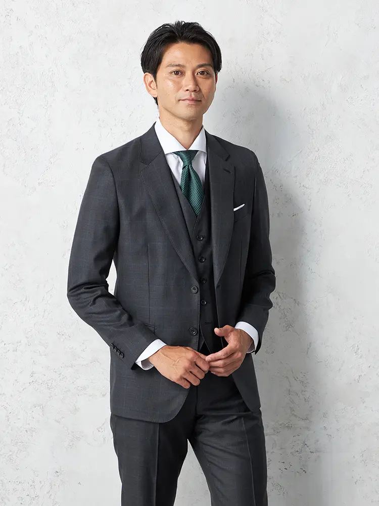 細かなチェック柄がさりげなくデザインされたセンターベントのノータックスリーピーススーツ。