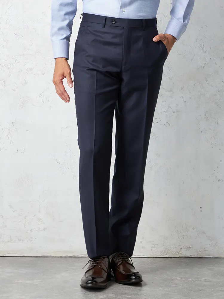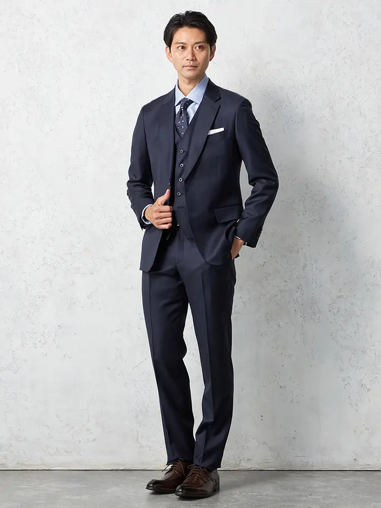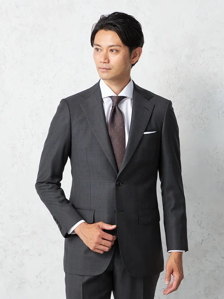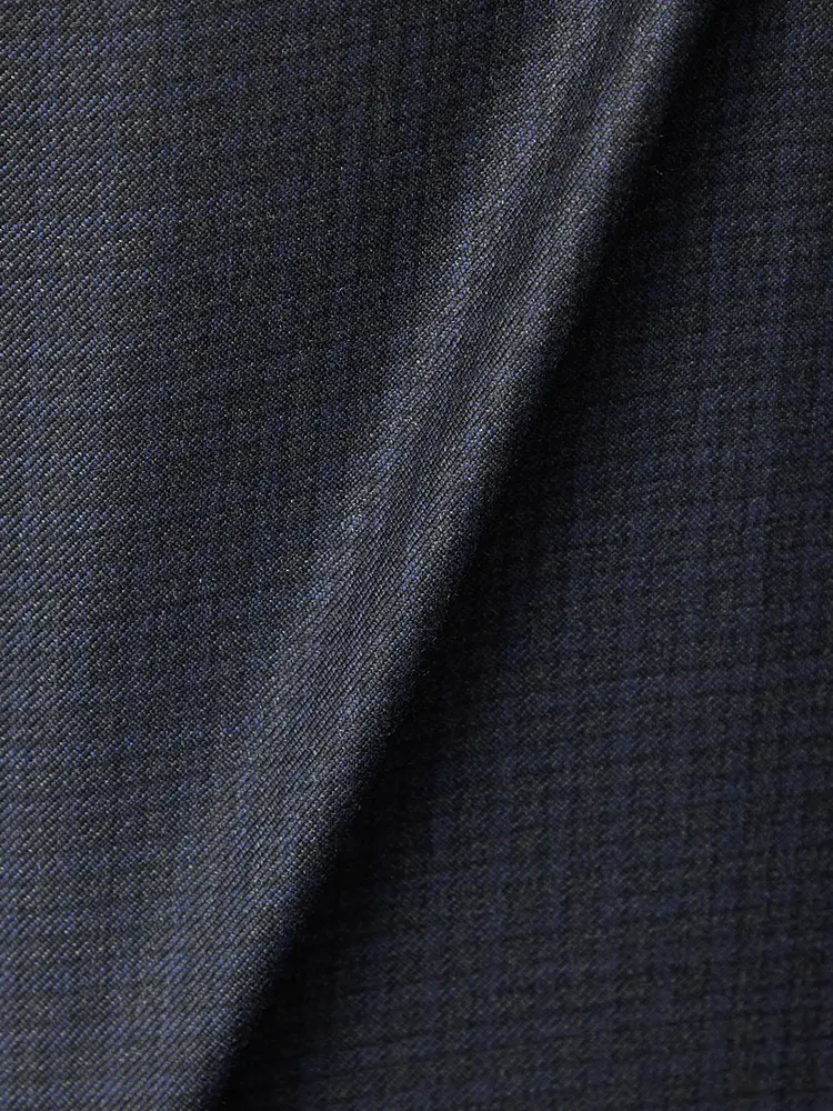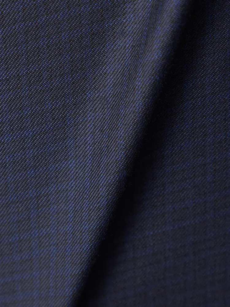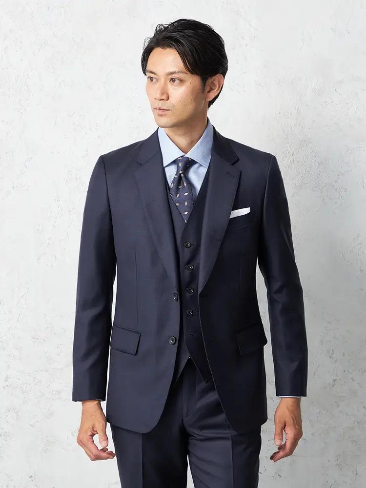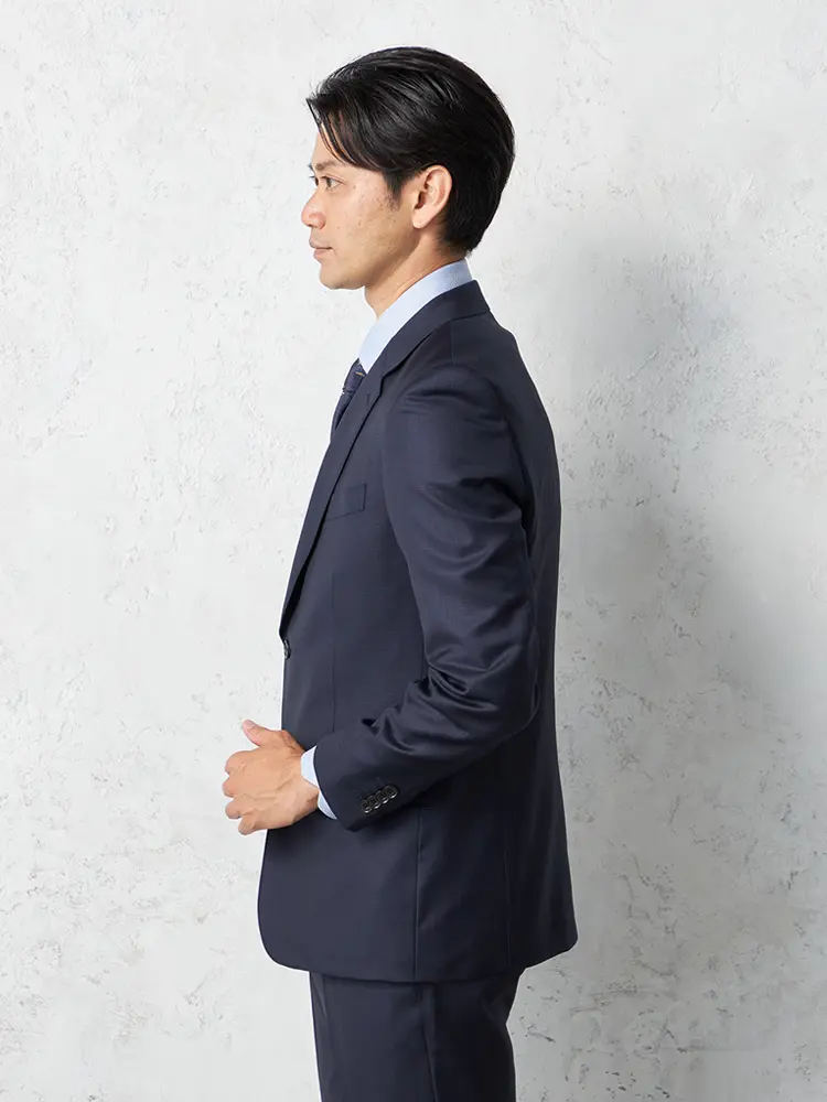 細かなチェック柄がさりげなくデザインされたセンターベントのノータックスリーピーススーツ。