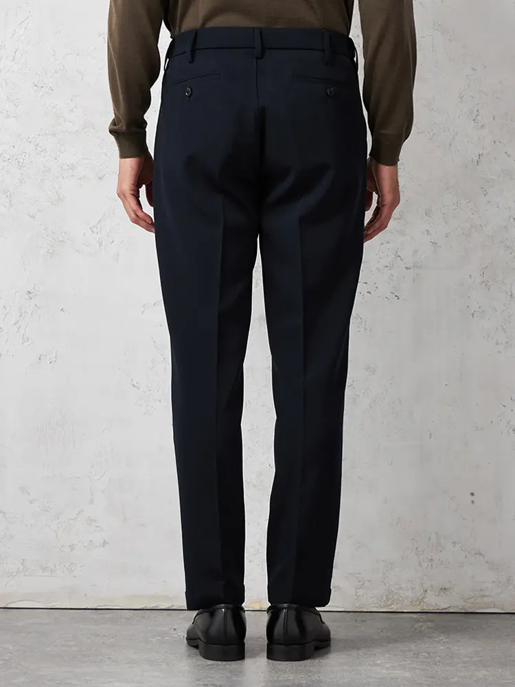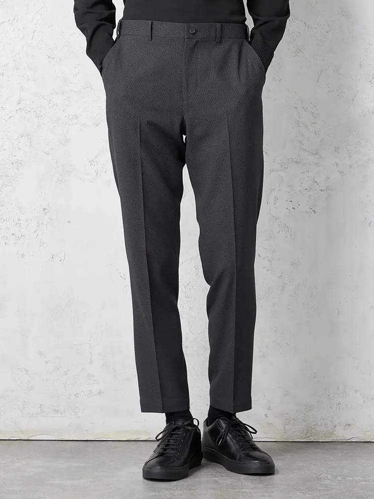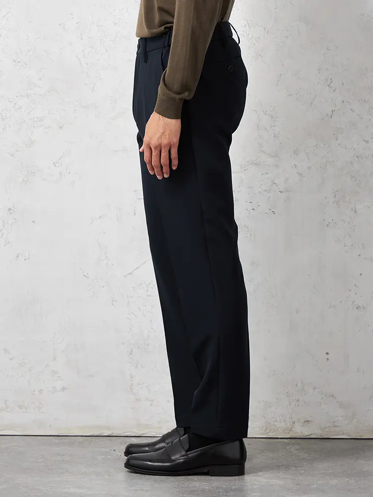 パンツの腰回りに生地の折り込みがなく、スッキリとしたシルエットを実現します。シンプルで洗練された印象を与え、すっきりとした着こなしが可能です。