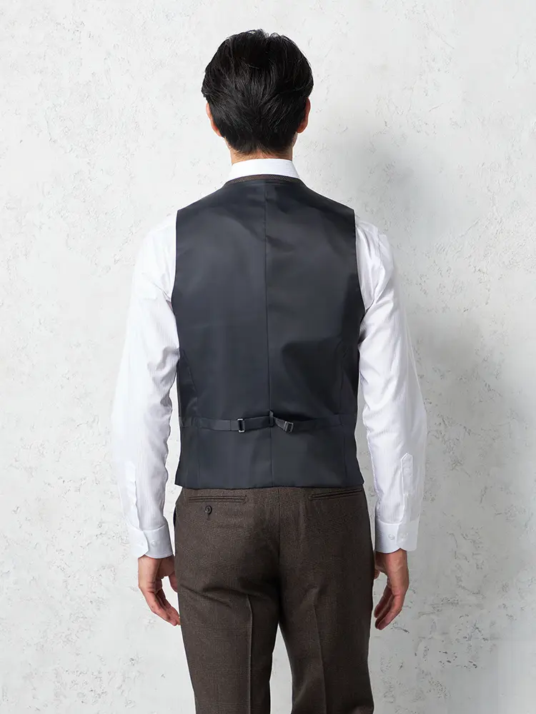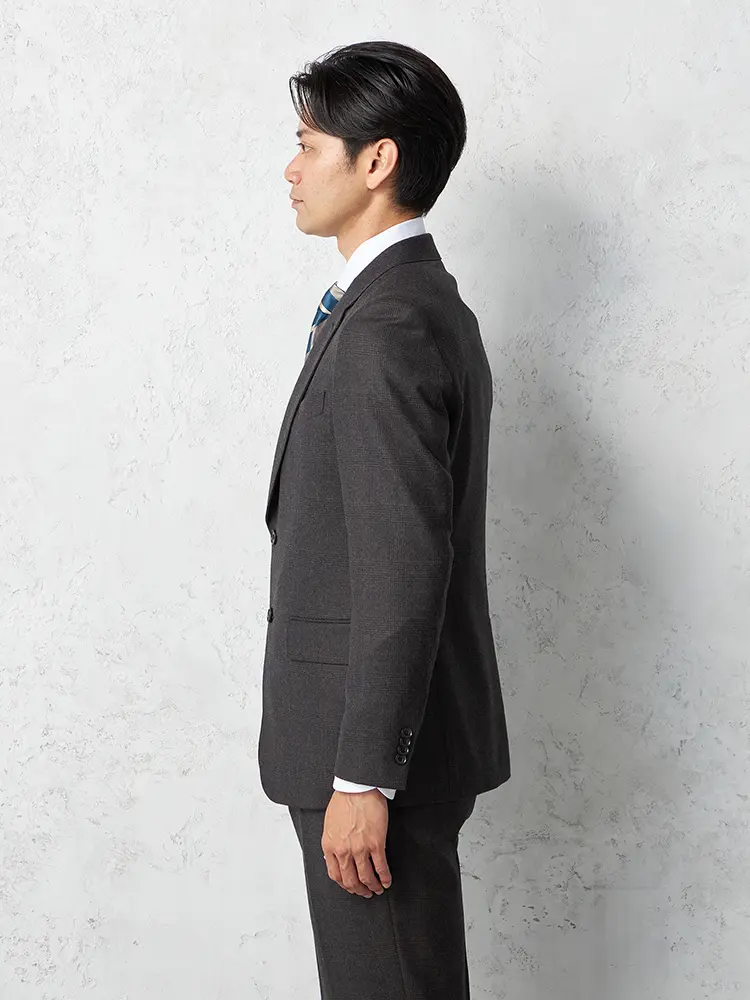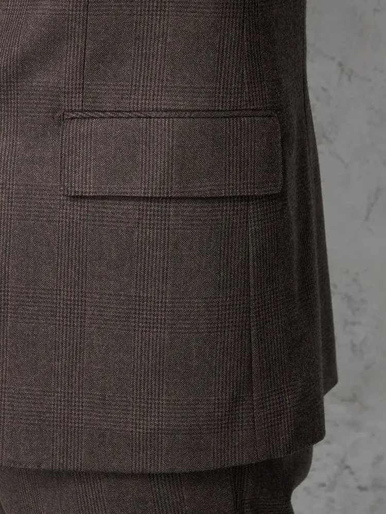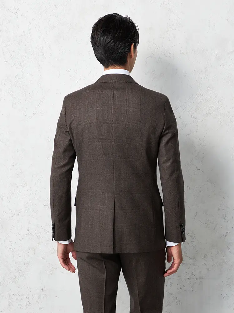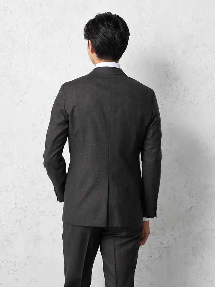 グレンチェック柄のセンターベントのノータックスリーピーススーツ。