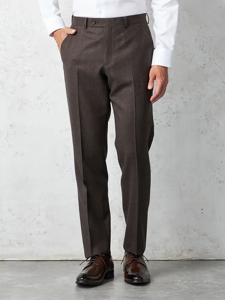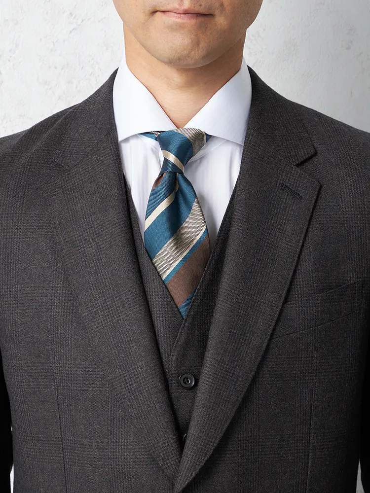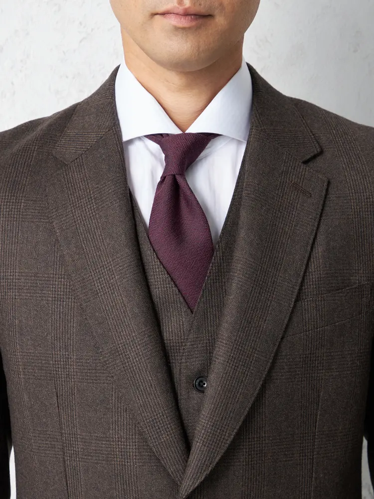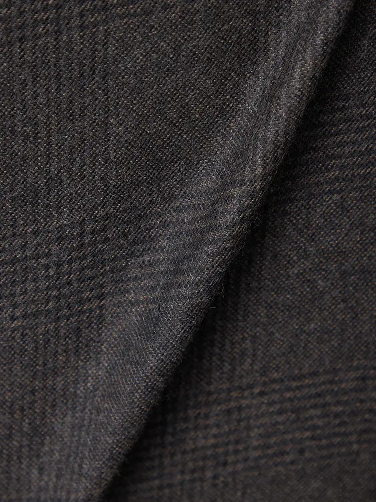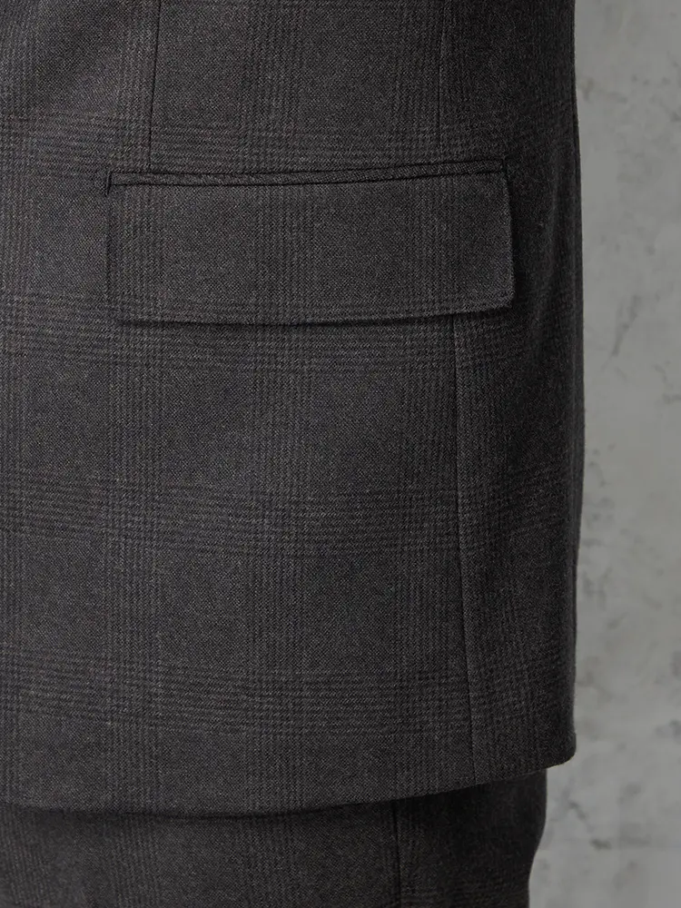 グレンチェック柄のセンターベントのノータックスリーピーススーツ。