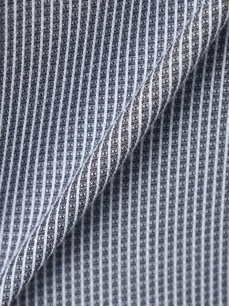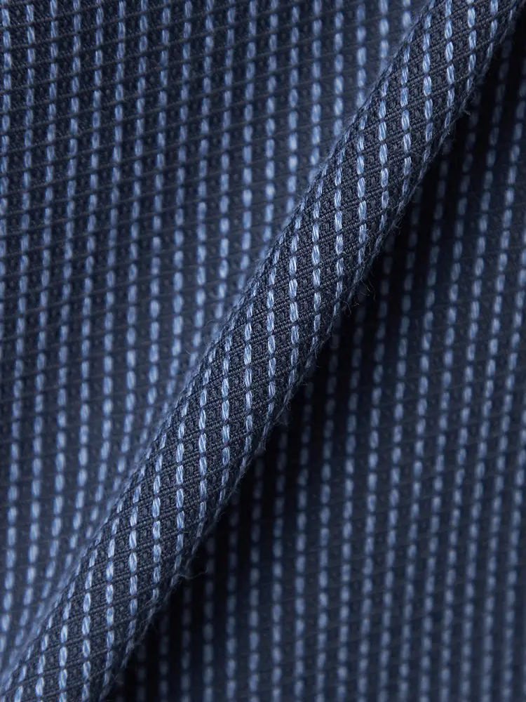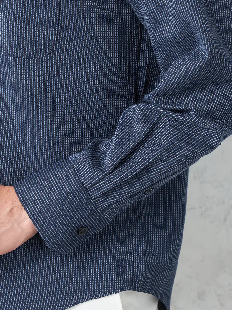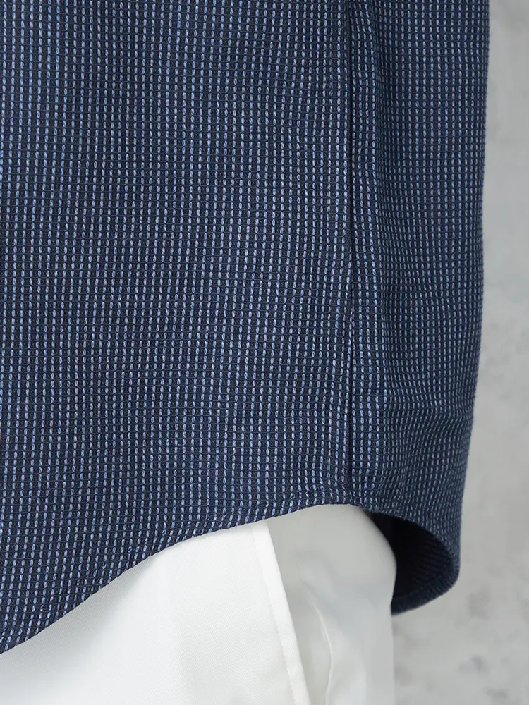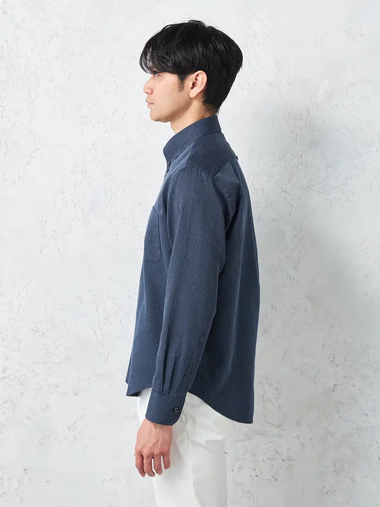 刺し子のような独特の表情と、お菓子のワッフルのように凸凹とした立体的な織り目が特徴の長袖シャツ。