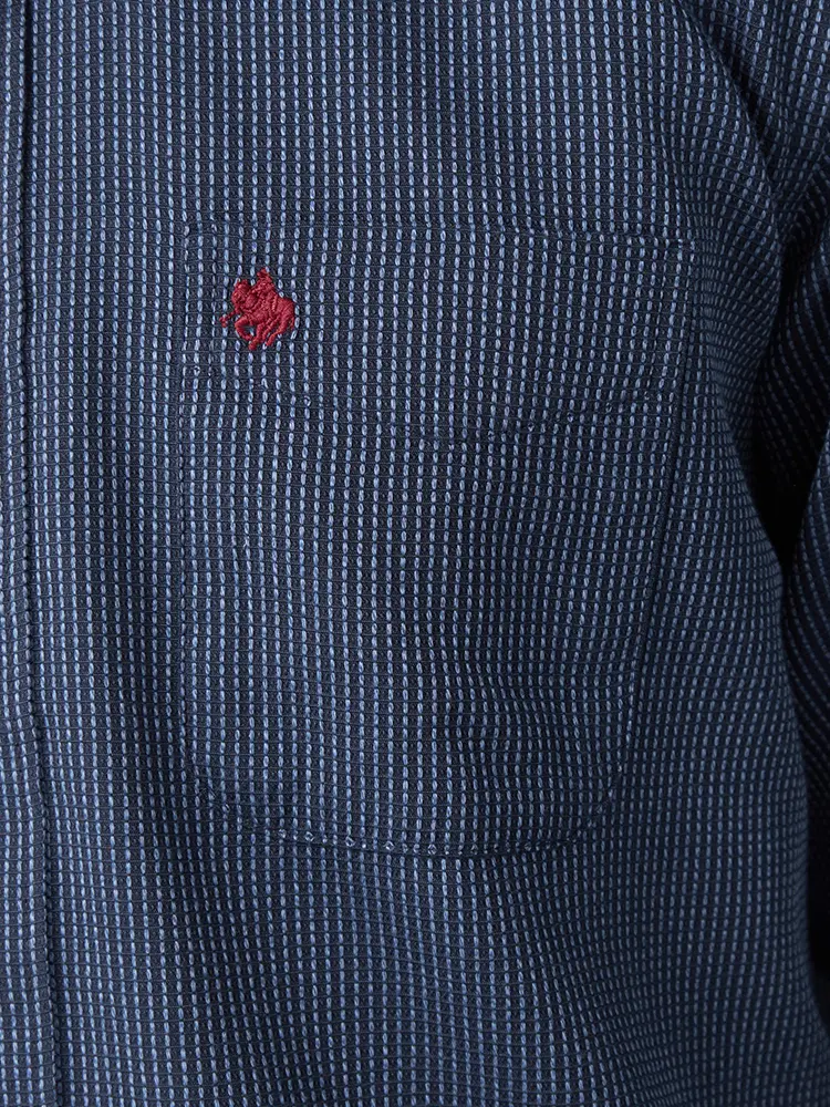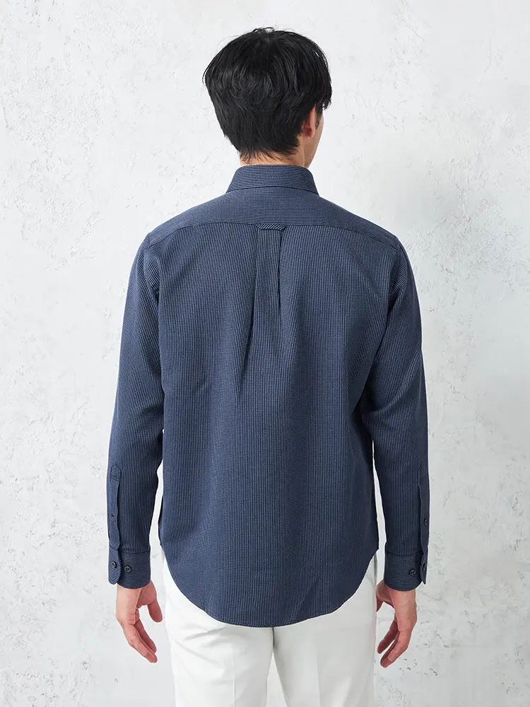 【POLO BCS】 デニムライク ワッフル調 ボタンダウン カジュアルインナー シャツ長袖 織柄無地 春夏(ブルー)