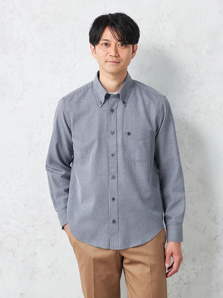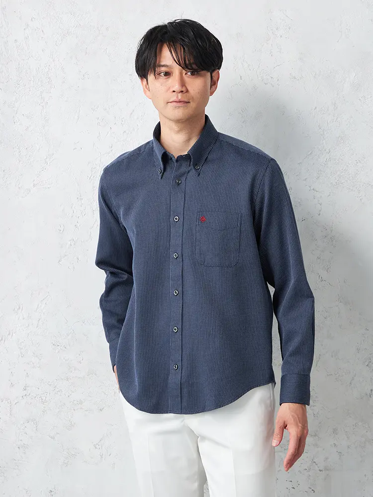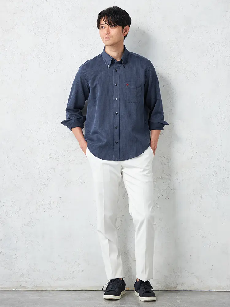 左胸のポケットにはワンポイント刺繍をあしらい、衿元はボタンダウンを採用。