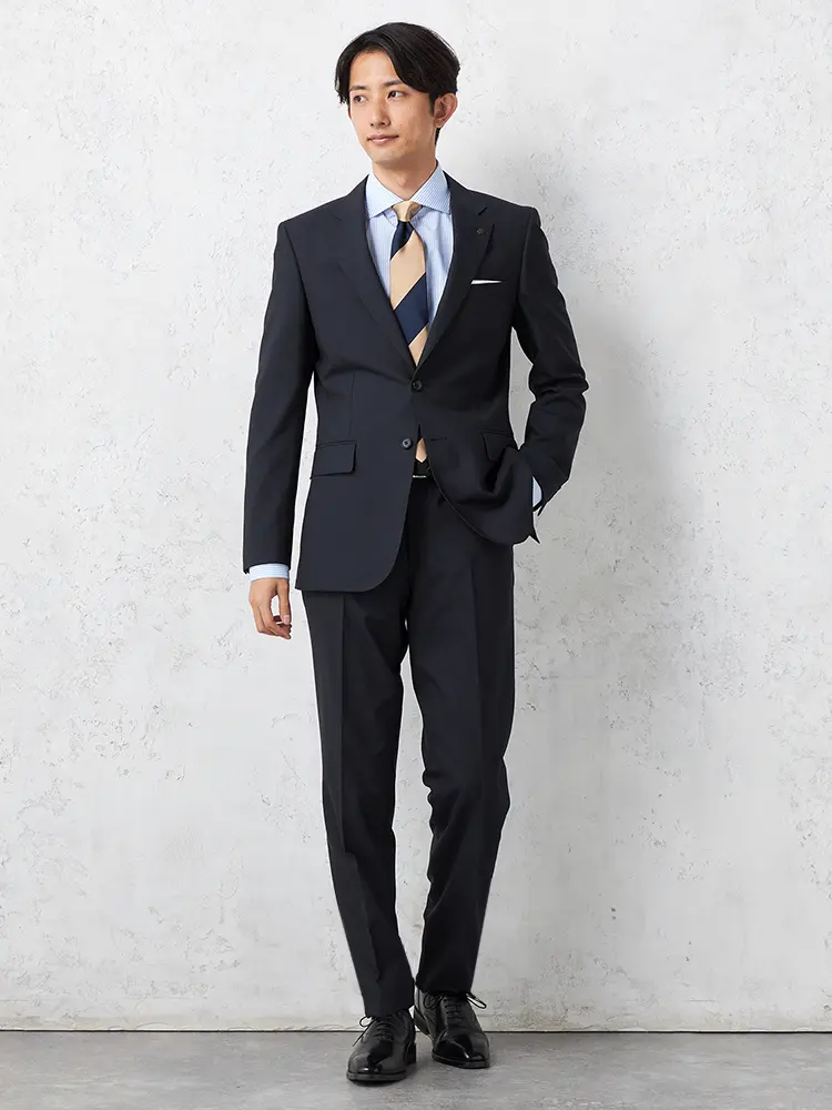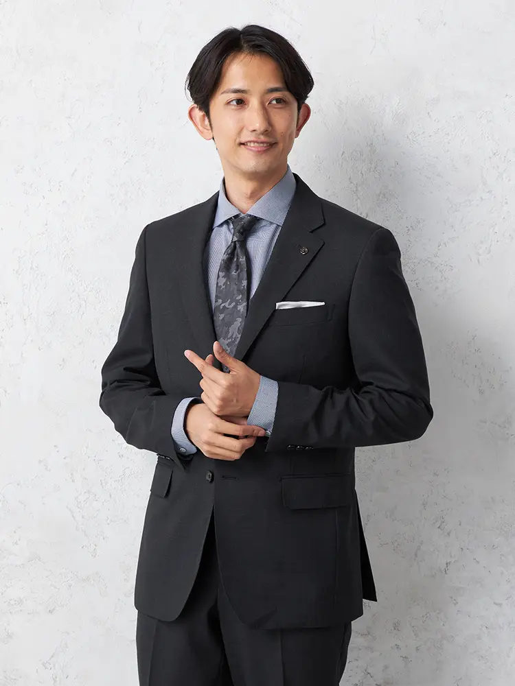 ビジネスやセレモニーに重宝するブラック無地スーツ。
