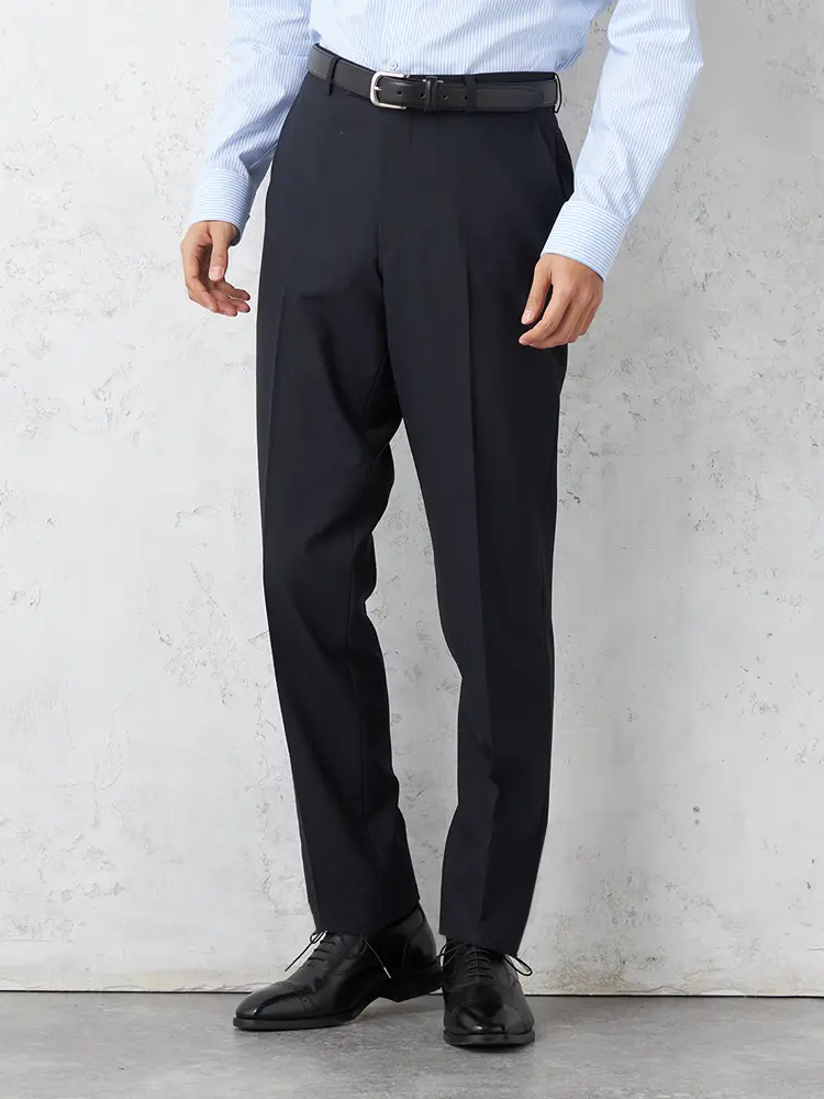 パンツの腰回りに生地の折り込みがなく、スッキリとしたシルエットを実現します。シンプルで洗練された印象を与え、すっきりとした着こなしが可能です。
