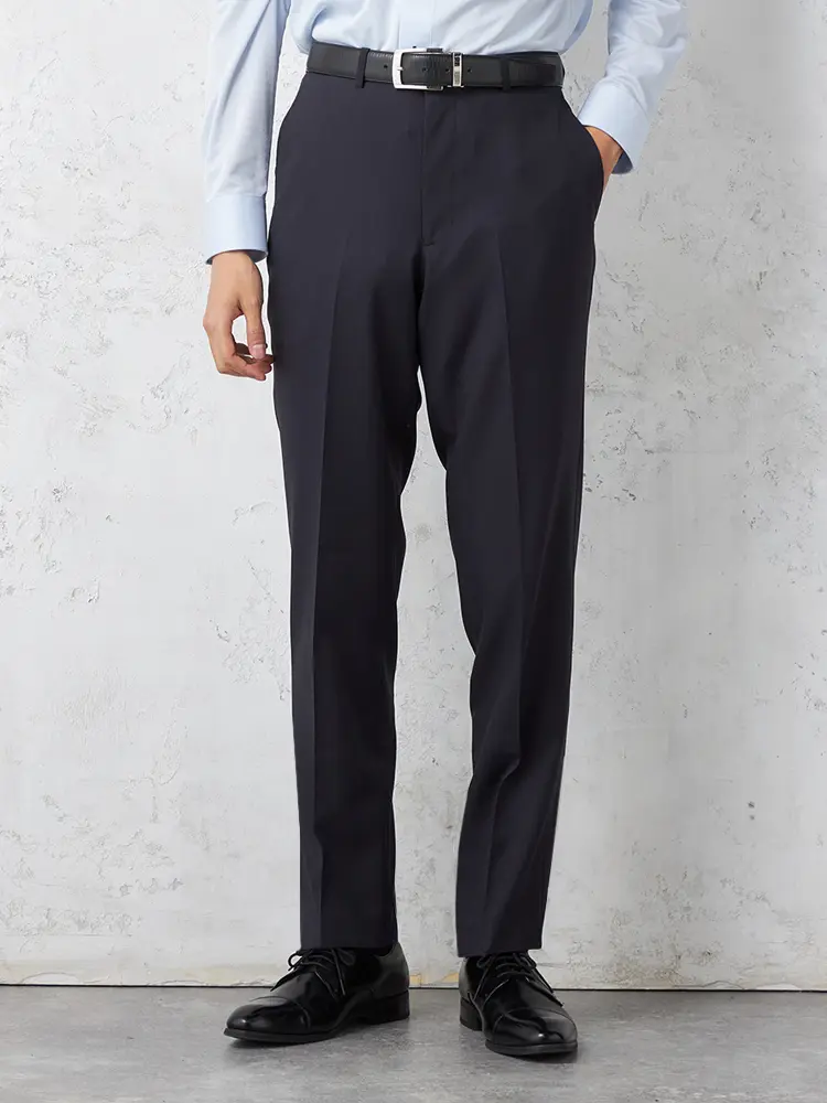 パンツの腰回りに生地の折り込みがなく、スッキリとしたシルエットを実現します。シンプルで洗練された印象を与え、すっきりとした着こなしが可能です。