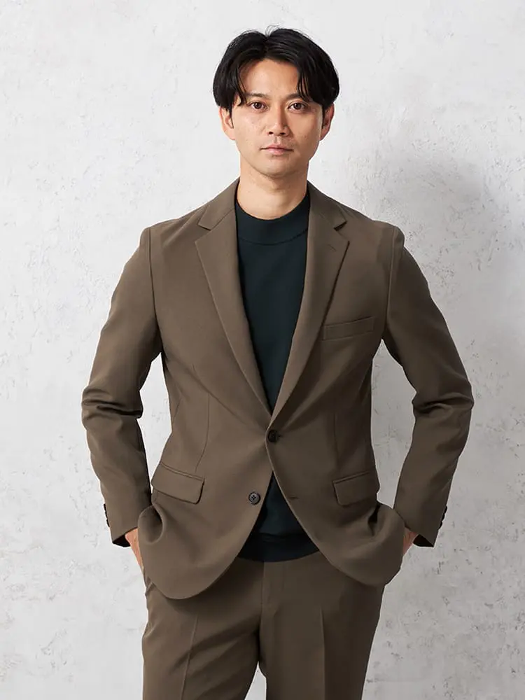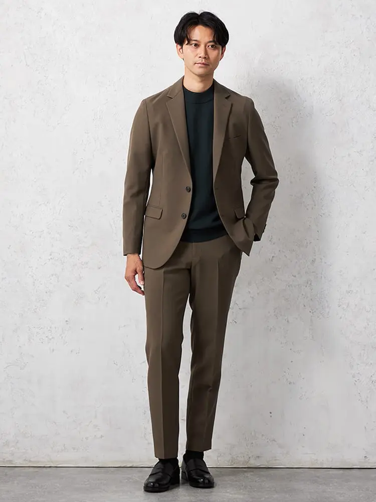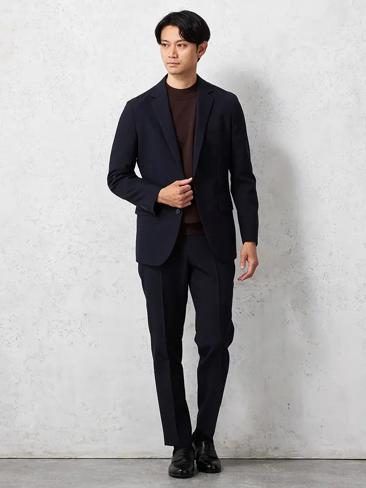 心地良くボディラインにフィットする背抜き仕様のテーラードジャケットとノータックのスマートなシルエットパンツのセットアップが登場。
