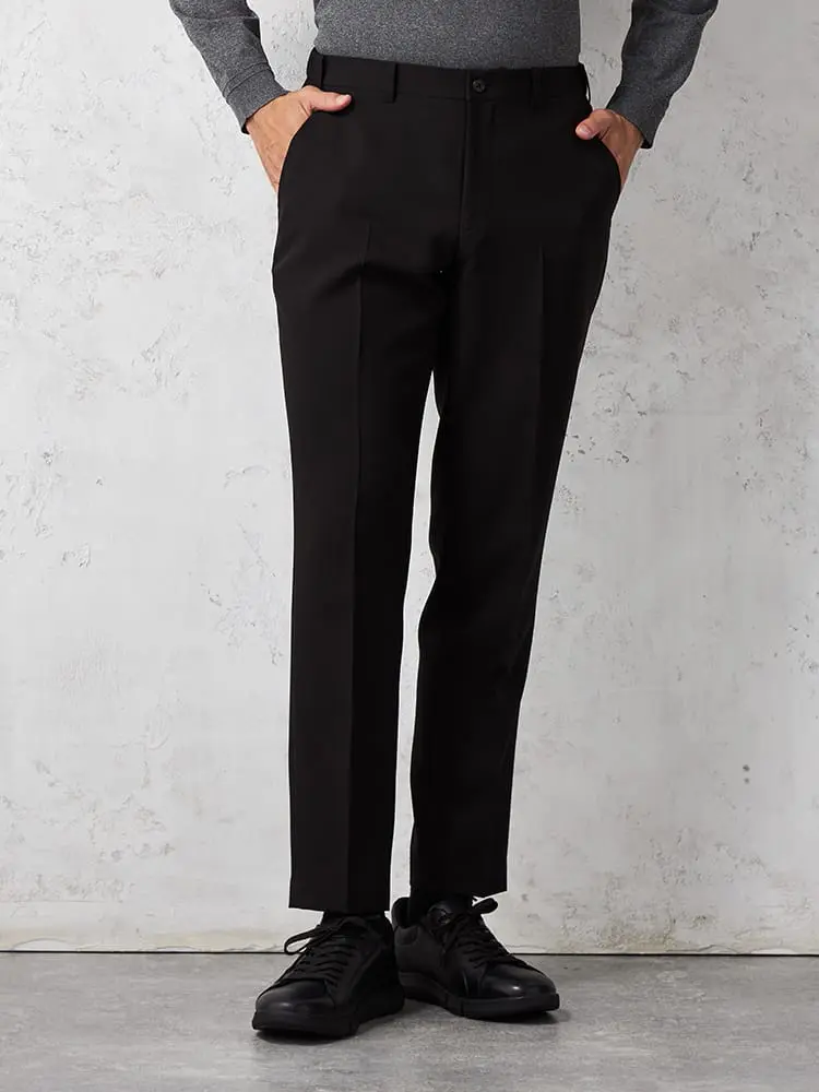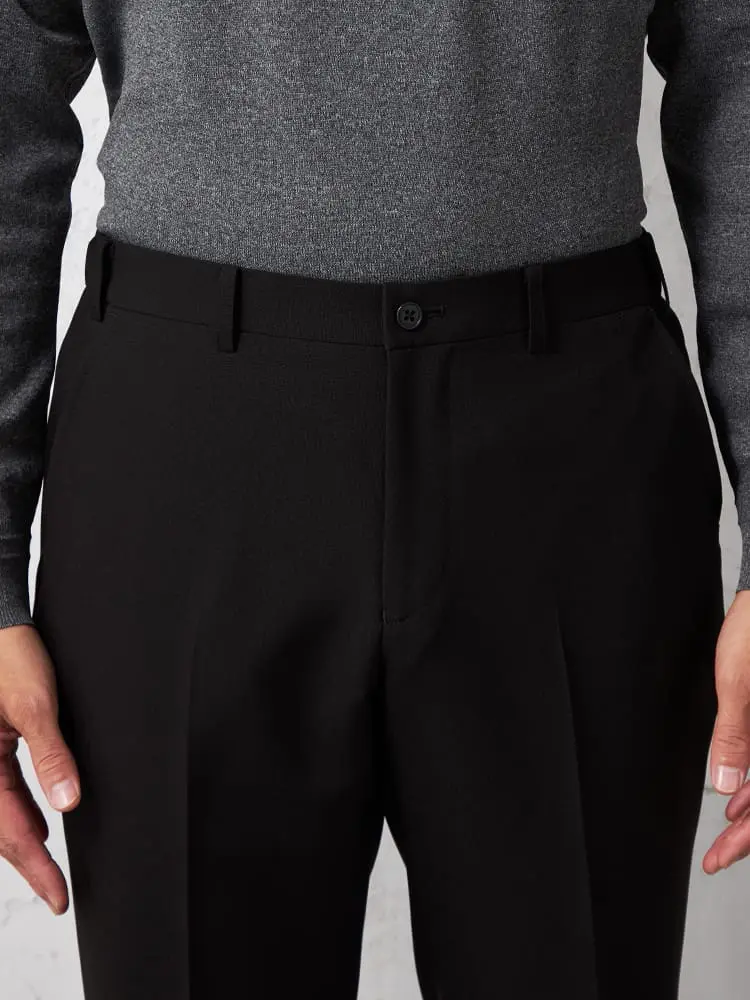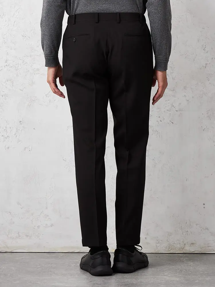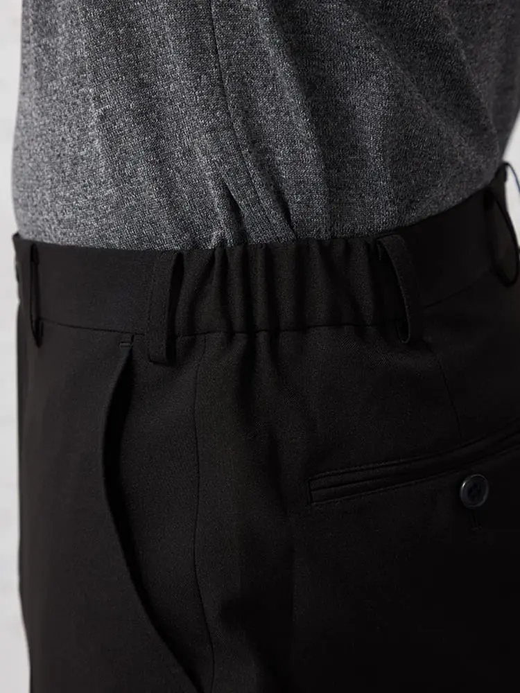 パンツの腰回りに生地の折り込みがなく、スッキリとしたシルエットを実現します。シンプルで洗練された印象を与え、すっきりとした着こなしが可能です。