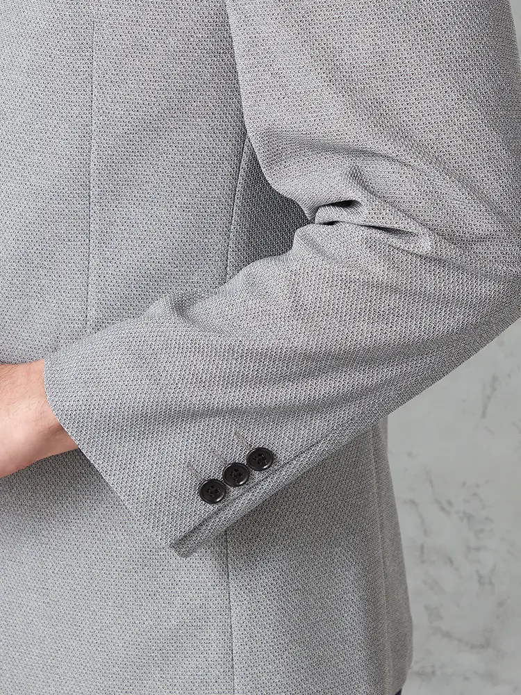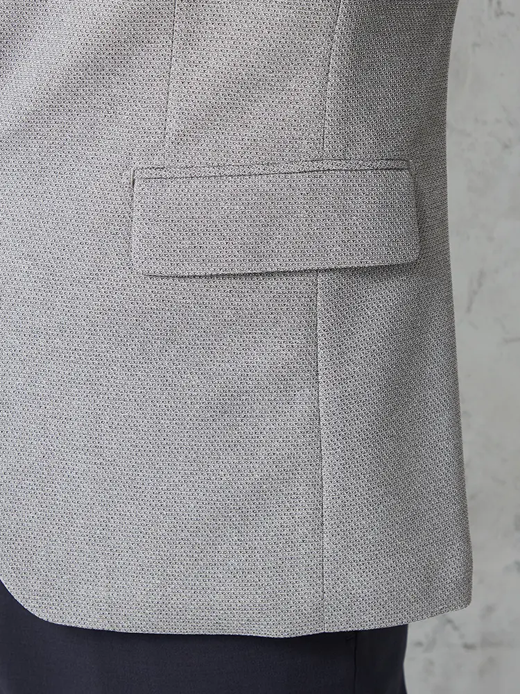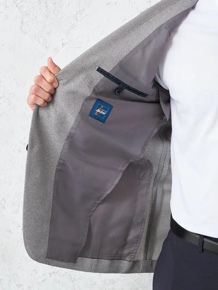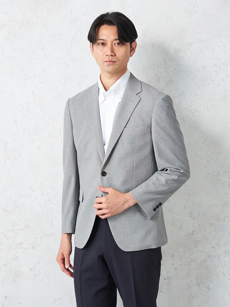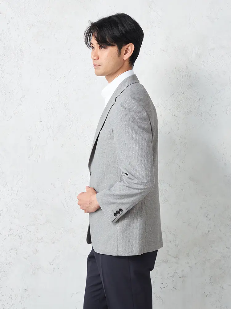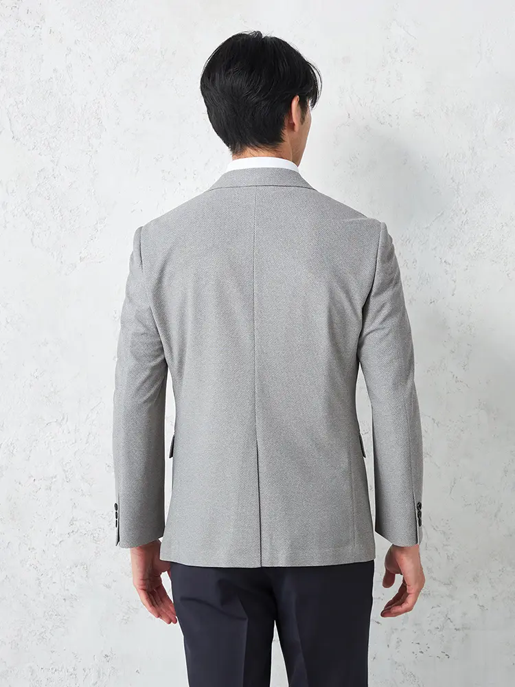 動きやすいストレッチ性を備えたニット素材を採用し、センターベントと半裏仕立てで軽やかな着心地に。