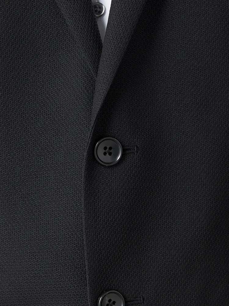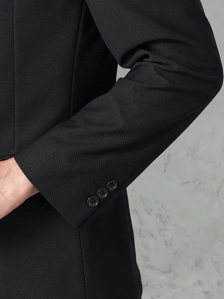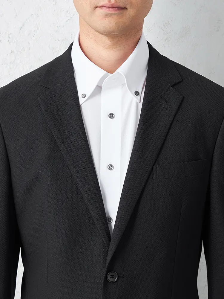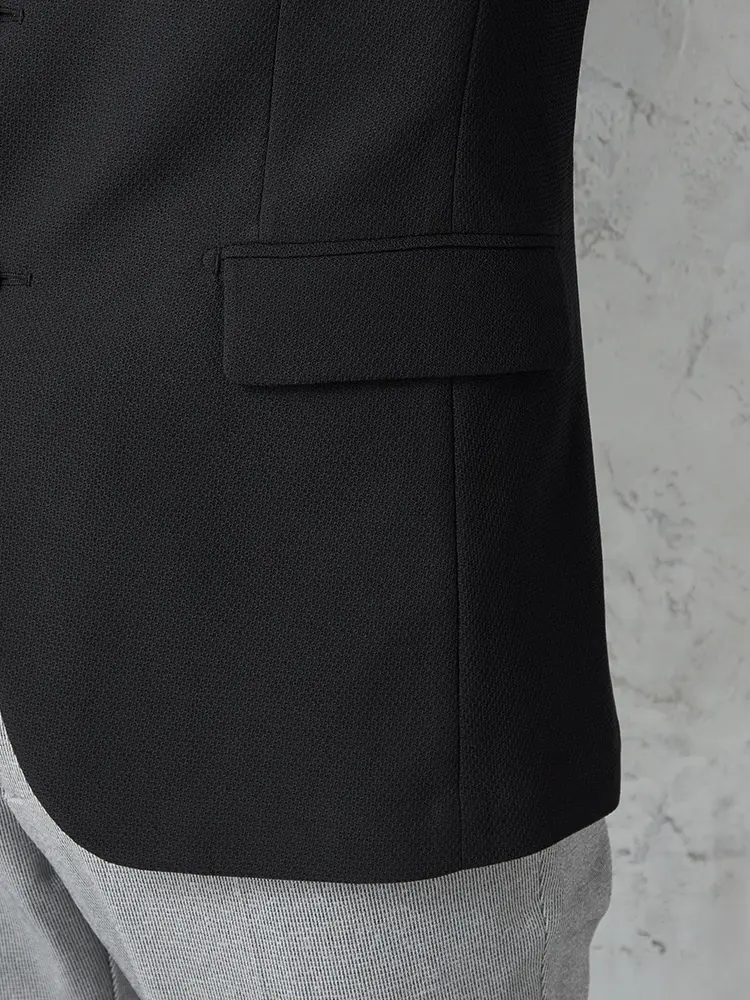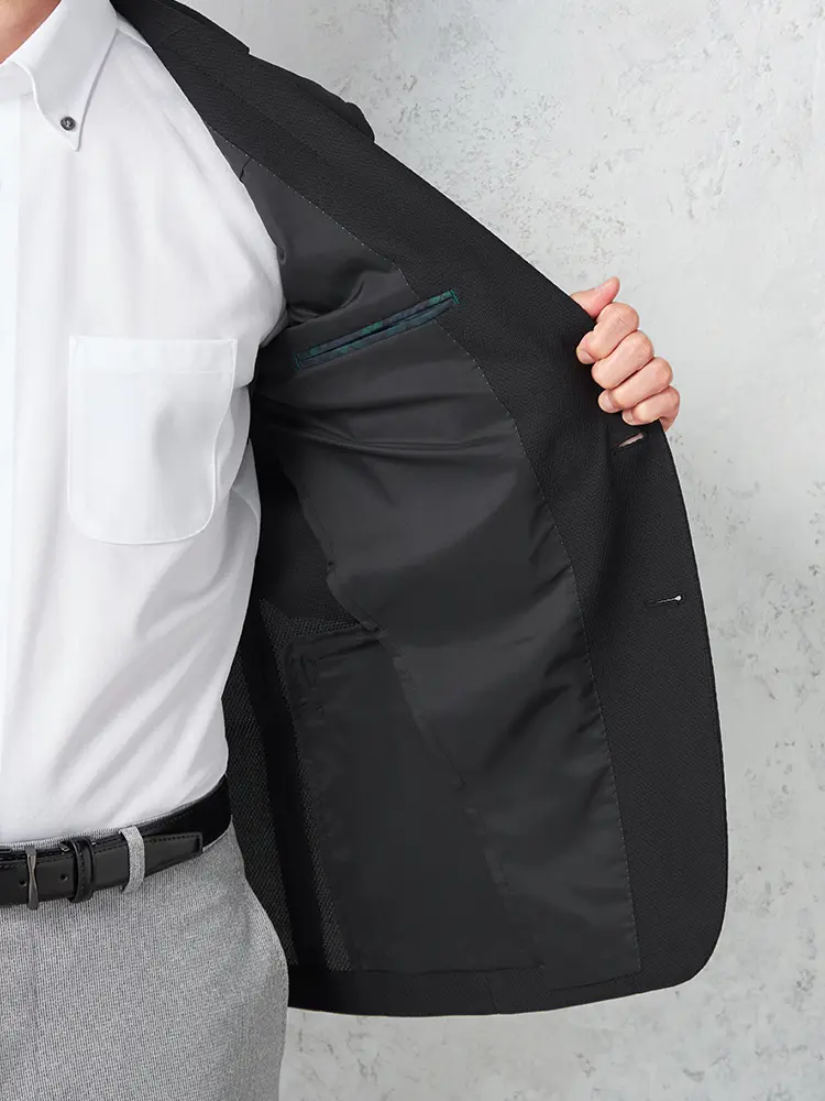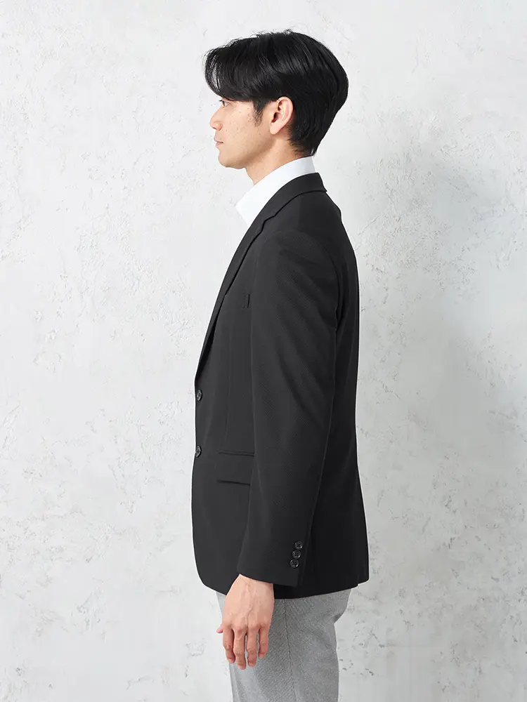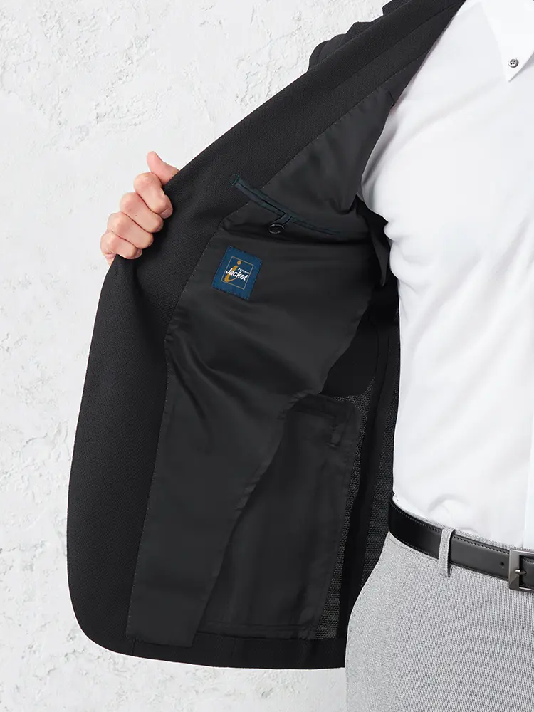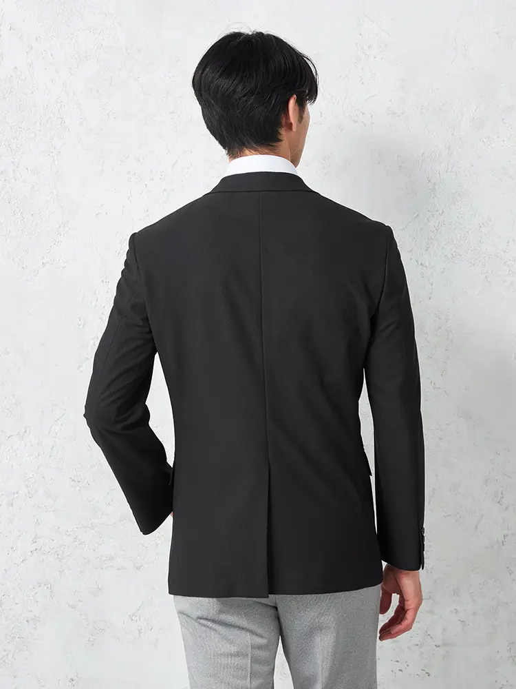 ナローラペルがシャープなVゾーンを演出し、半裏仕立てとセンターベントで快適な着心地を実現しました。